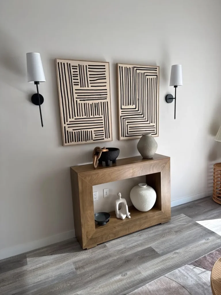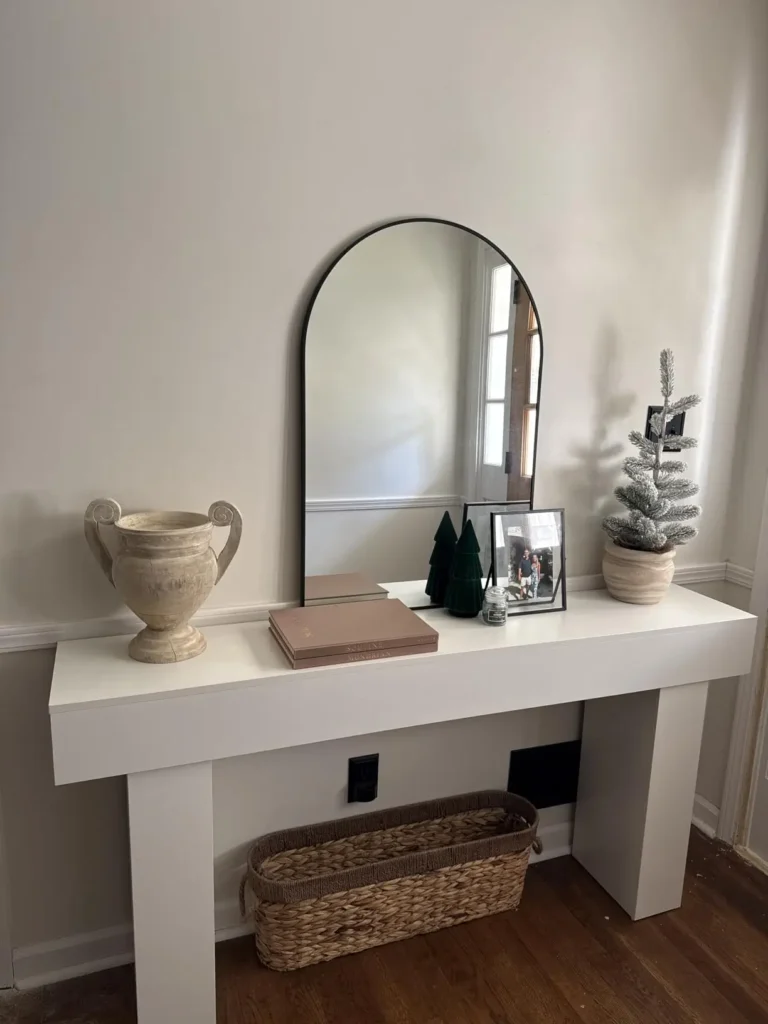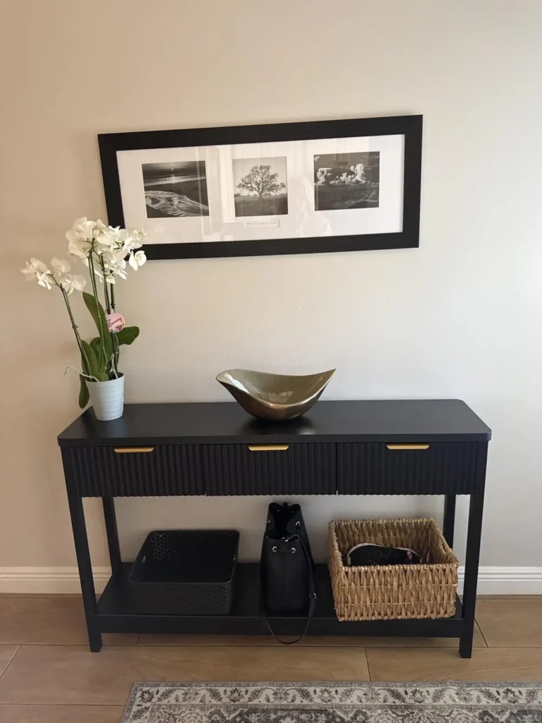 This entry table feels cozy, balanced, and perfect for styling with baskets underneath.