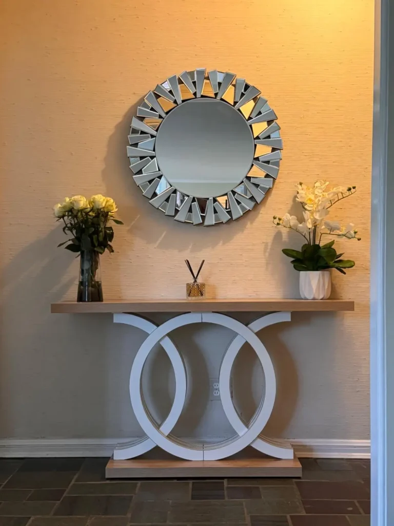 The circular flower shaped base gives this entry table a modern glam vibe.