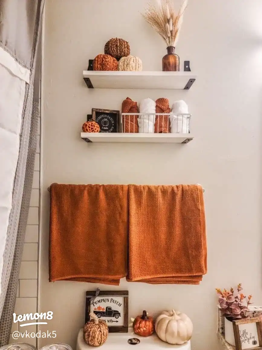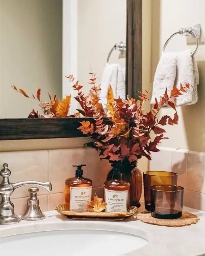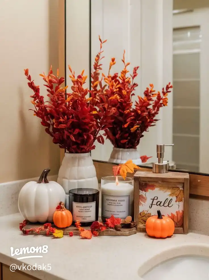 A white pumpkin-shaped vase filled with orange or red fall blooms instantly sets the tone. Itโ€™s a cute and classy combo that gives your bathroom a festive boost without being over-the-top. I like placing this on the counter or windowsill, it softens up the space and brings in a pop of seasonal color.