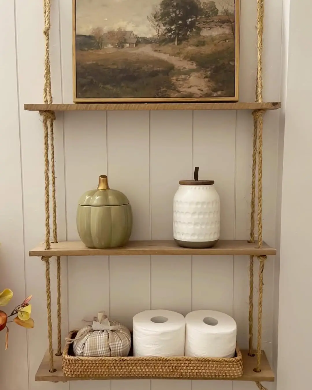 Add a couple of baby pumpkins in jars and youโ€™ve got the coziest little corner in your bathroom. This is a great way to use vertical space, especially if your counter is already packed.