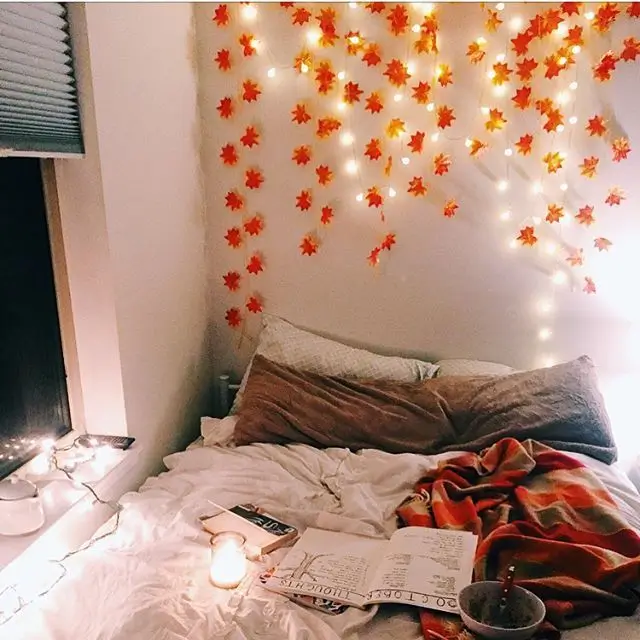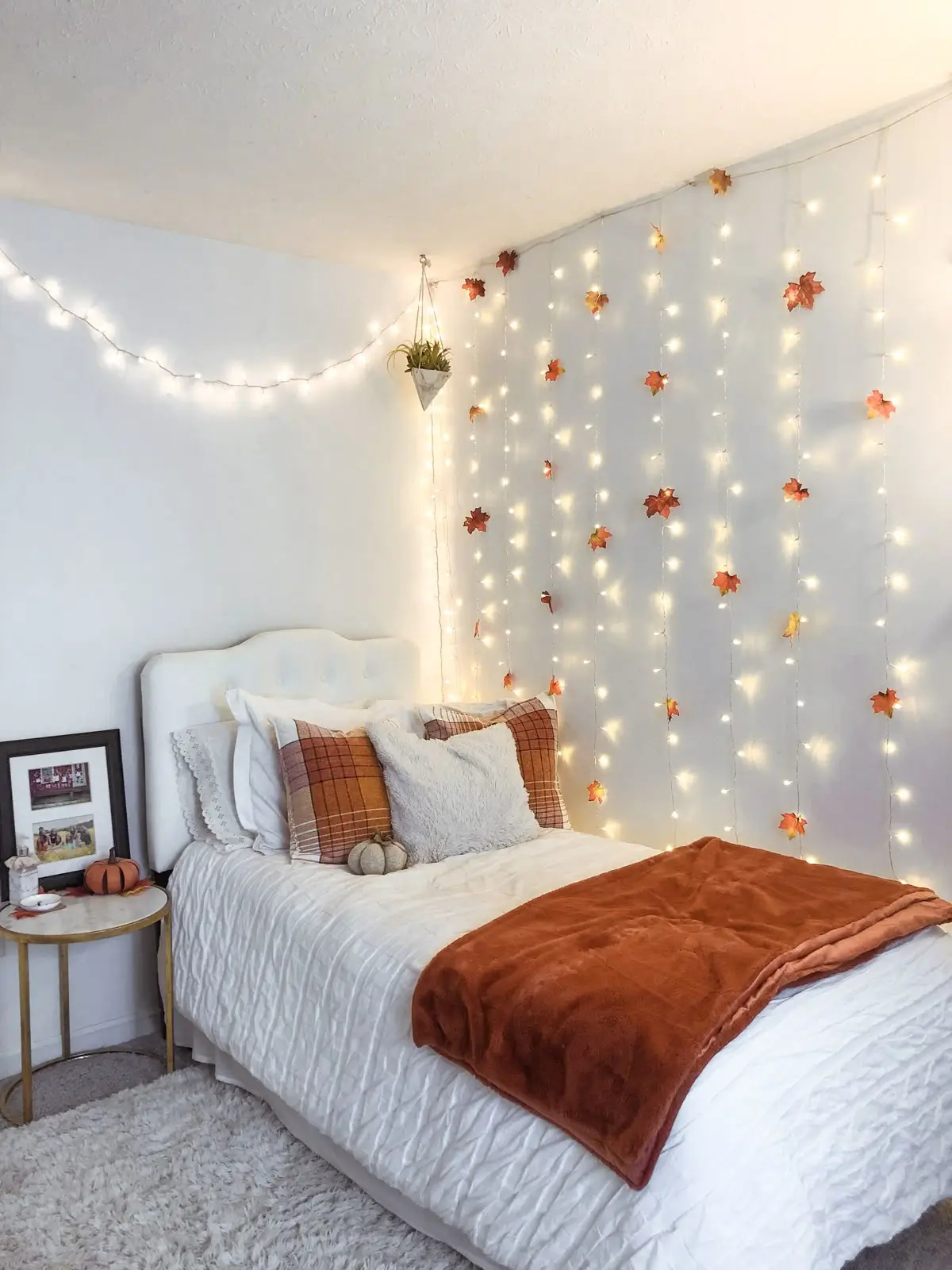 Nothing says fall dorm decor like warm twinkly lights and golden leaves cascading down your wall. Vertical string lights are perfect for small spaces because they create instant ambiance without taking up any floor space.