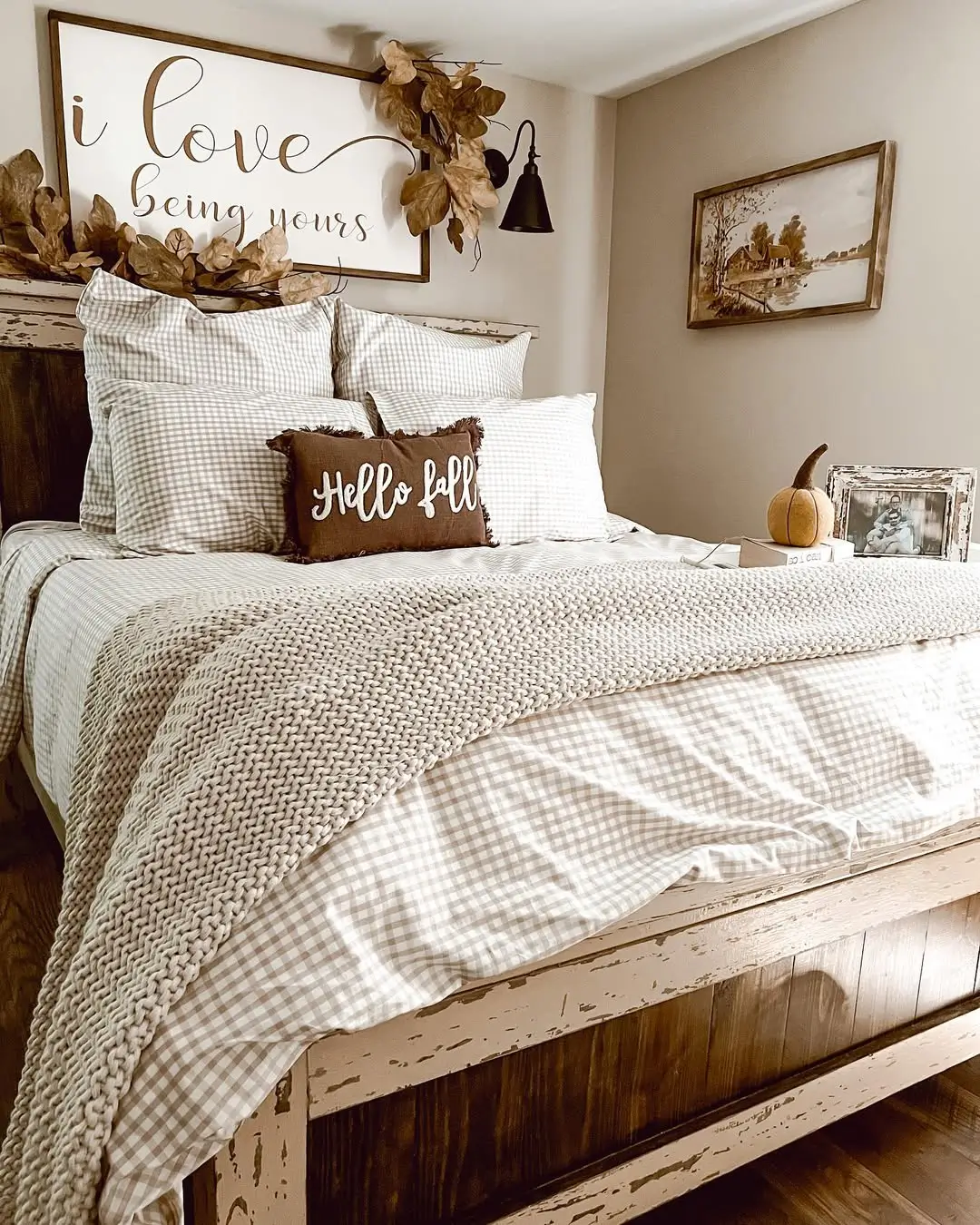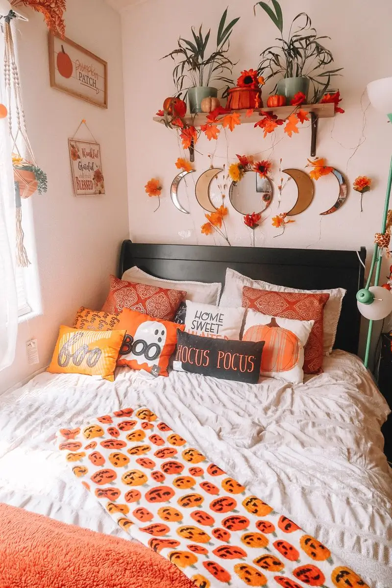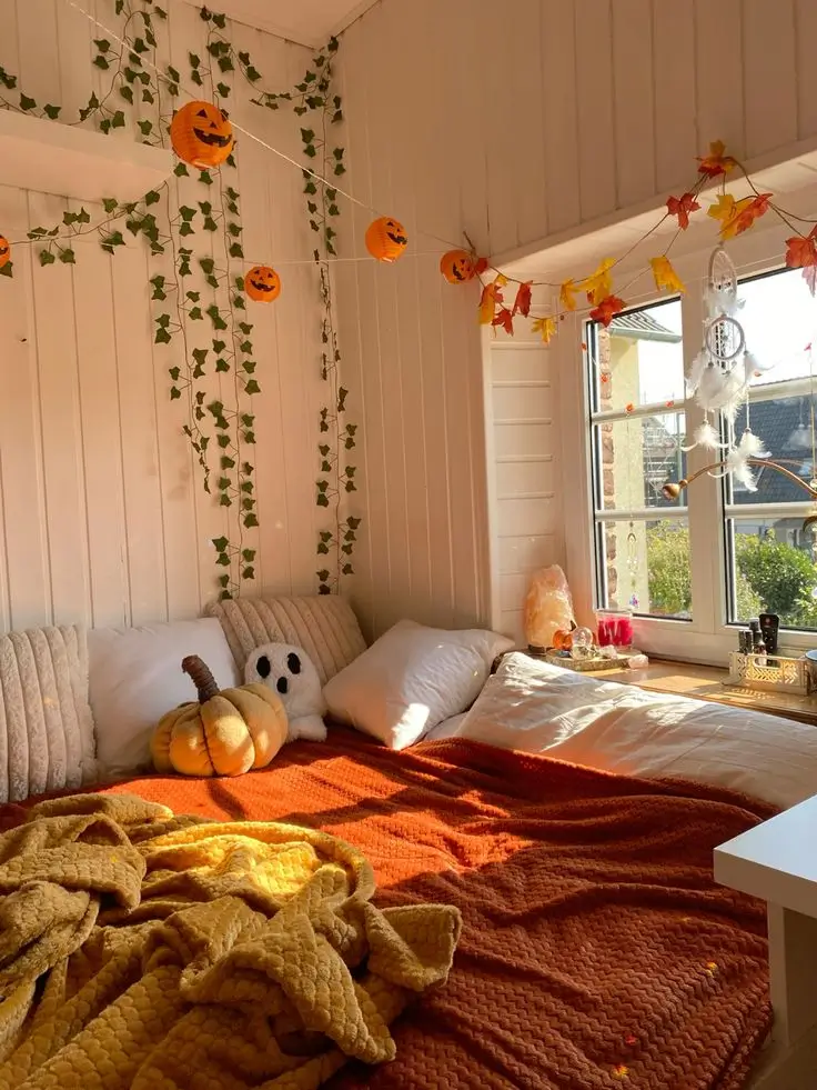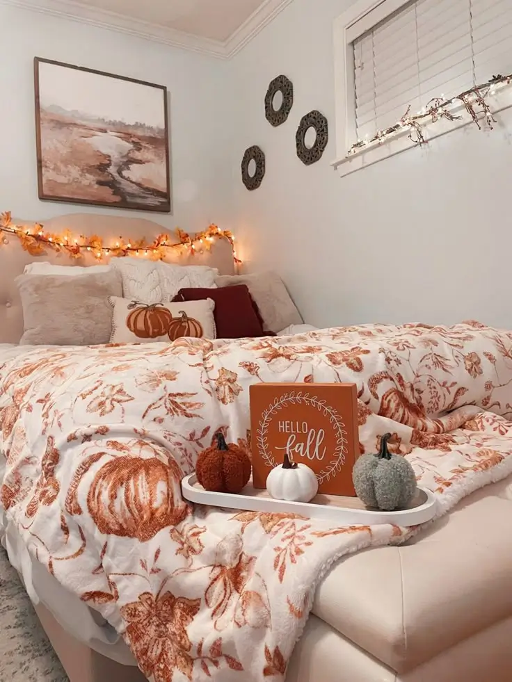 A light up garland is like two décor items in one because it’s both pretty and functional. Draping one along your headboard adds a warm, cozy glow that’s especially inviting on chilly fall nights. Choose garlands with orange, red, or deep golden leaves for that classic autumn feel.