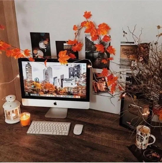 For a simple but charming touch, add a maple leaf garland to your desk or shelf. You can drape it over open shelving or even along the edge of your desk for a cute little seasonal nod. The pop of autumn color makes even the most basic dorm furniture feel a little more special.