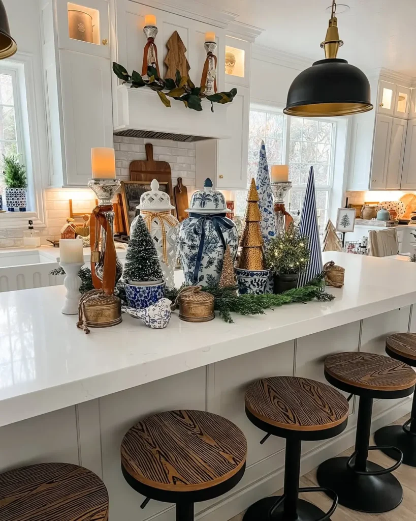 Amy from amywilsondesigns created the dreamiest setup with chinoiserie pieces in blue and white tones, paired with brass accent trees and classic gold bells. The result is a Christmas kitchen island that feels timeless and elegant.