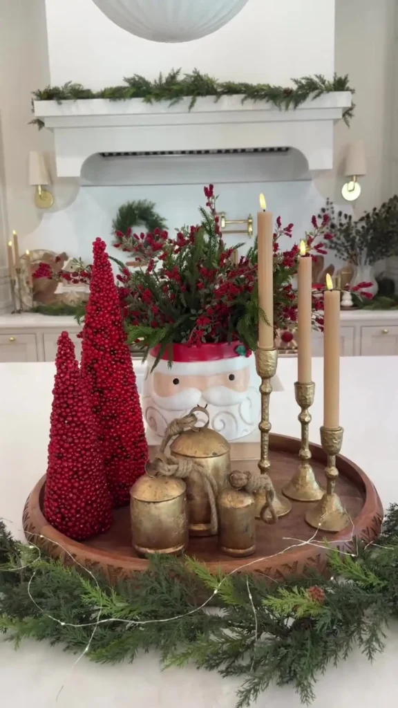 Let’s be honest, Christmas without Santa just feels incomplete. I adore this fun and festive idea: a Santa Claus vase filled with cozy winter branches, surrounded by red tabletop trees, brass candle stands, and little bells.