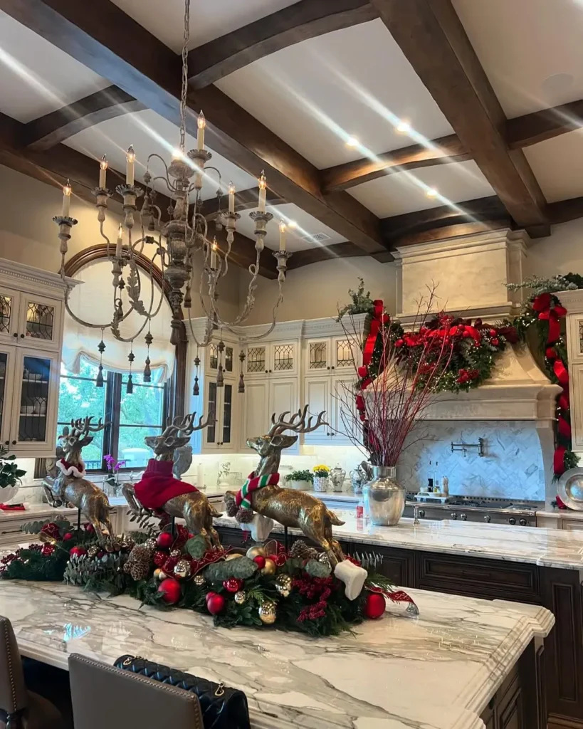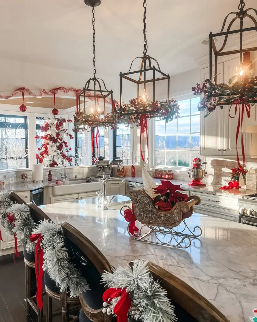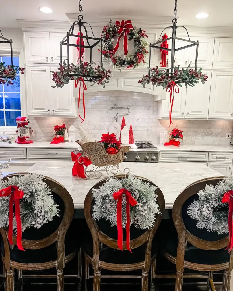 Okay, can we take a moment to appreciate how cute this one is? Jennifer from the.sugar.plum.palace on Instagram absolutely nailed it with this festive setup. Her Christmas kitchen island looks like it came straight out of a Hallmark movie, complete with red bows, winter wreaths, and the most adorable rustic sleigh centerpiece.