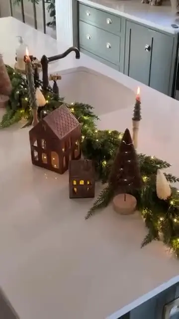 Nothing says cozy Christmas like a little wooden village scene. Arrange miniature wooden houses, light-up garlands, green candles, and tiny trees across your island for a rustic winter wonderland look.