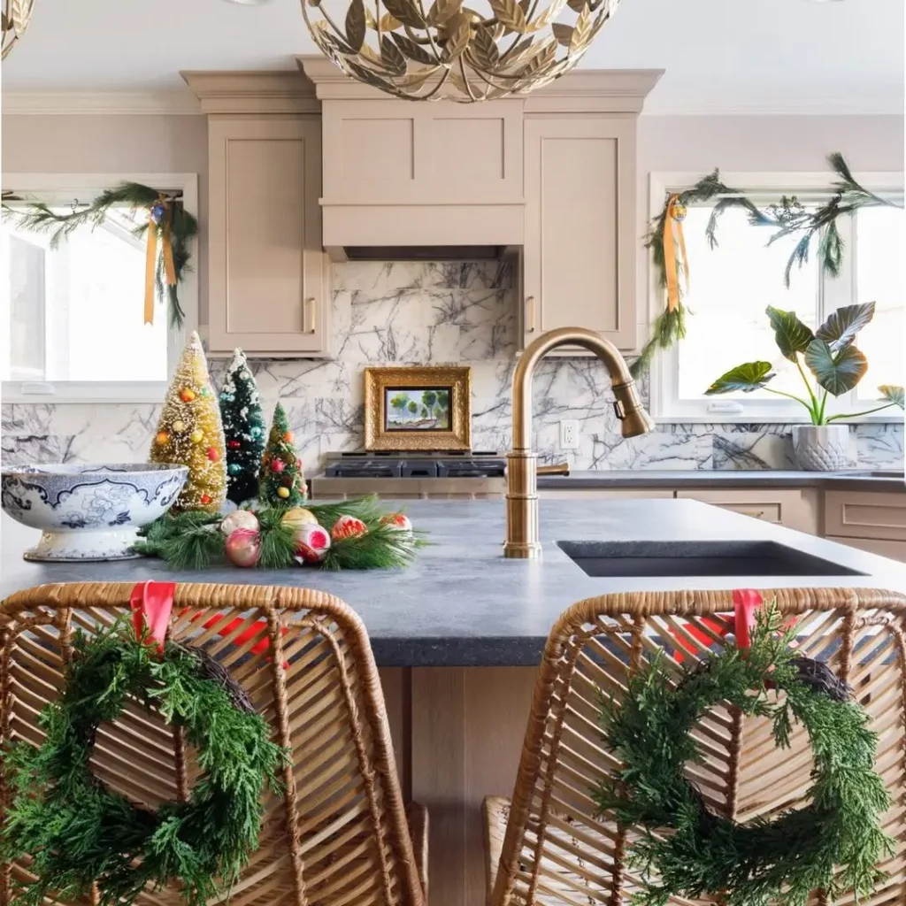 It’s the easiest Christmas kitchen island decor idea ever, and it instantly adds color, texture, and a touch of sparkle to your space.