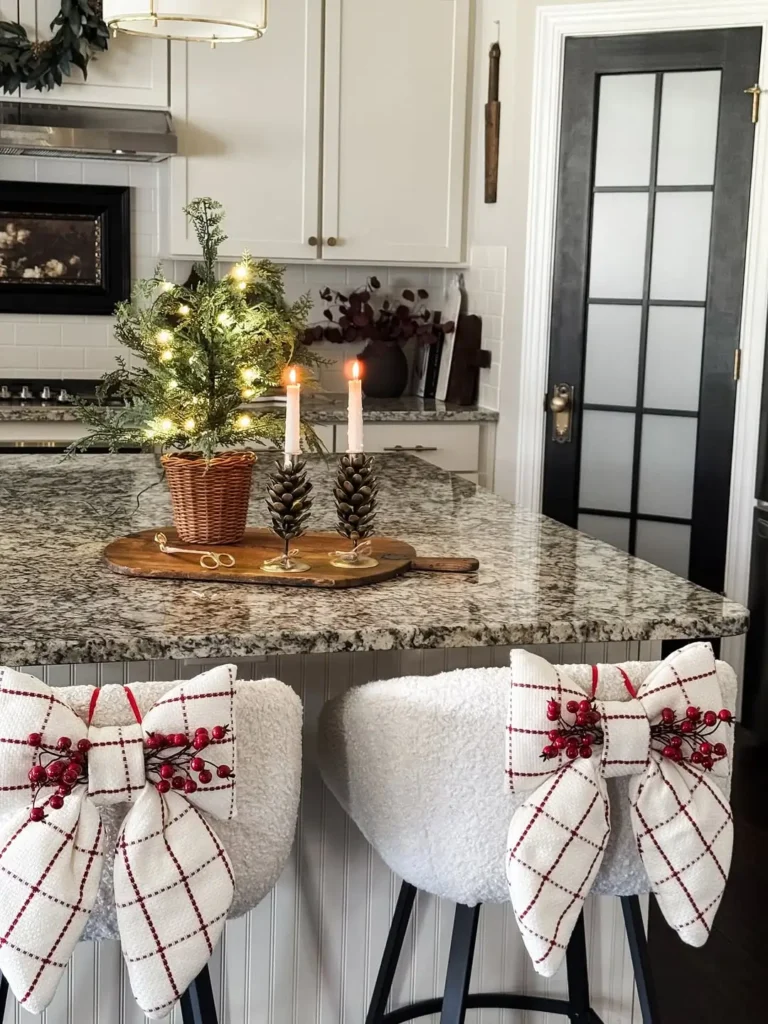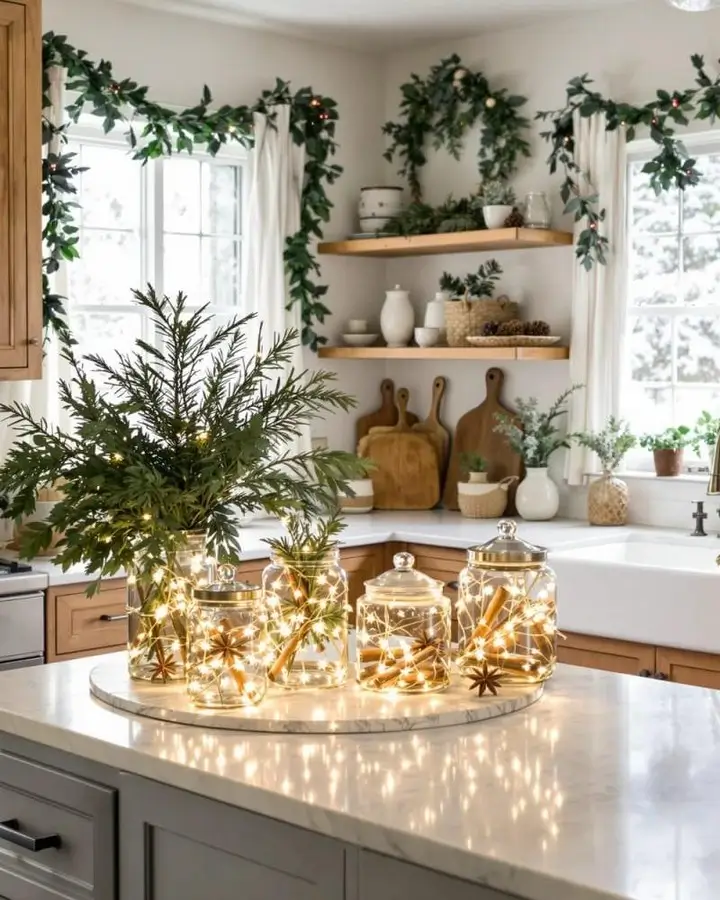 It’s joyful, nostalgic, and instantly fills the space with holiday cheer. Bonus tip: use battery-operated string lights so you don’t have cords running across the counter.