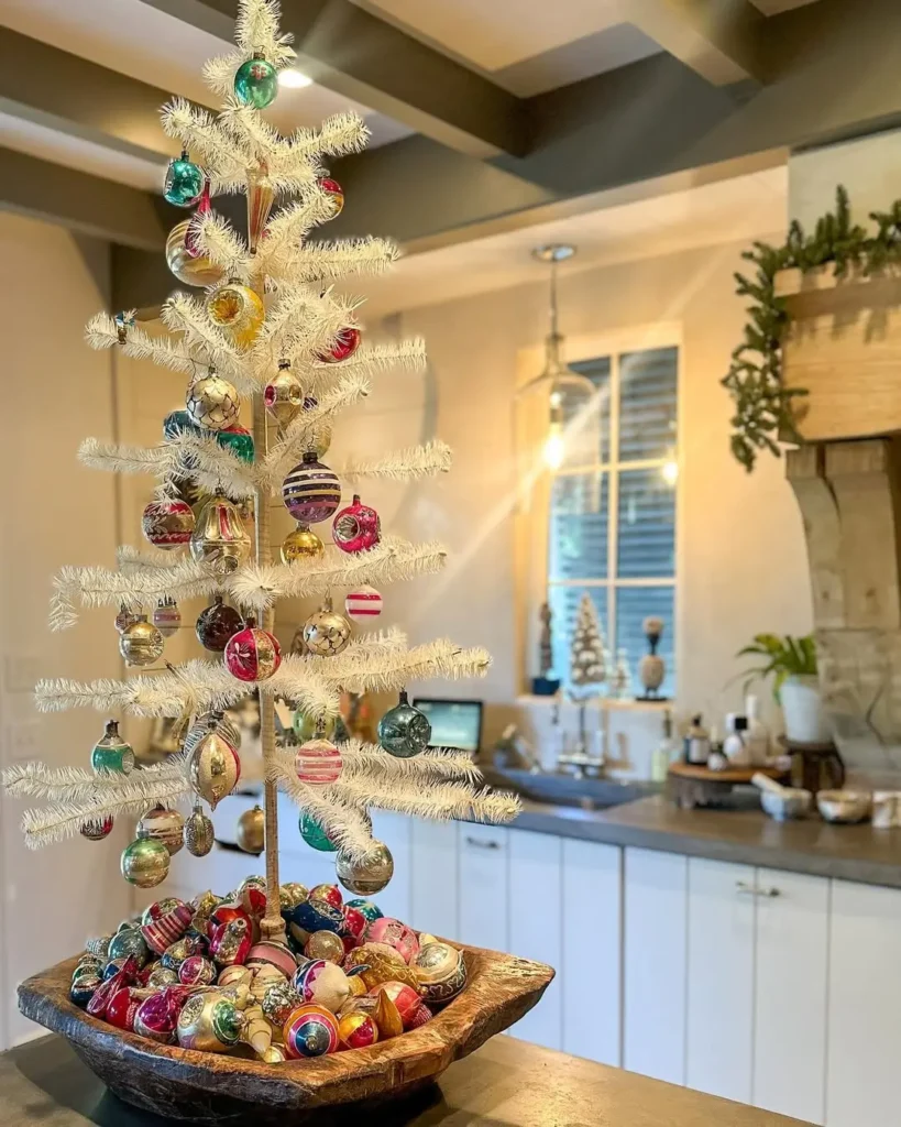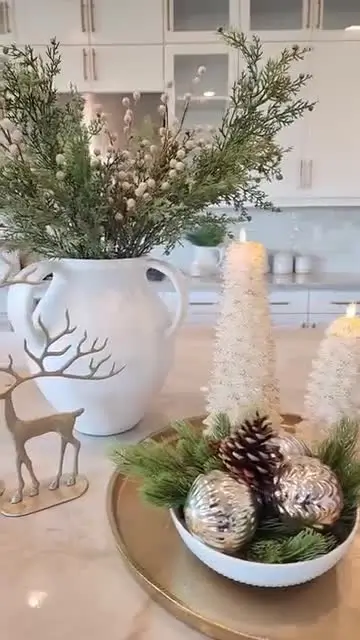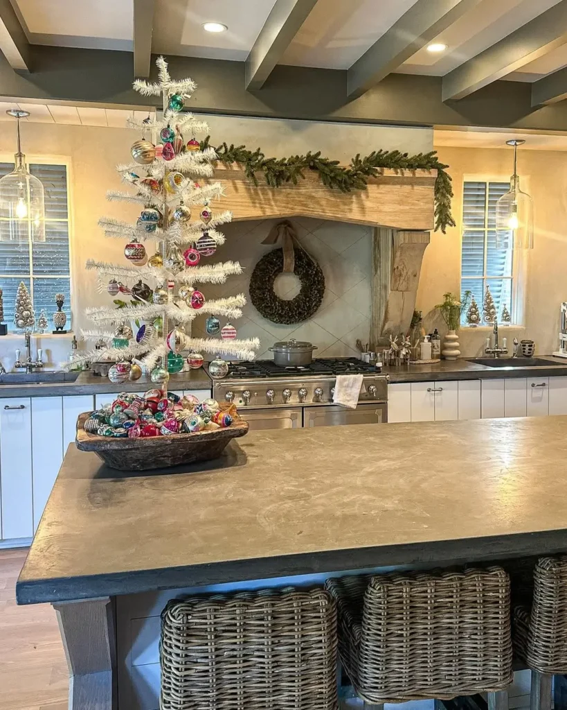 When in doubt, keep it simple. Grab a pretty bowl or vase, fill it with ornaments, and place it right in the center of your island. You can mix metallics for a glam vibe or go rustic with wooden and fabric ornaments.