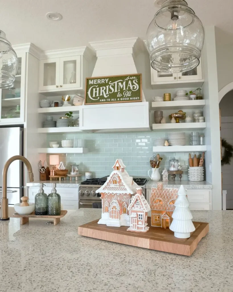 I’m officially obsessed with this idea from valleyviewabode. It’s whimsical, nostalgic, and downright adorable. Picture this: a tiny gingerbread village right in the middle of your kitchen island, surrounded by twinkle lights and faux snow.