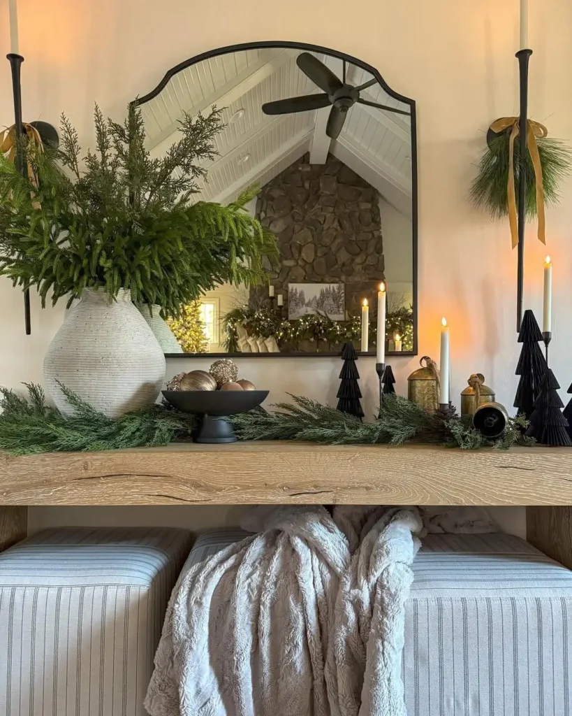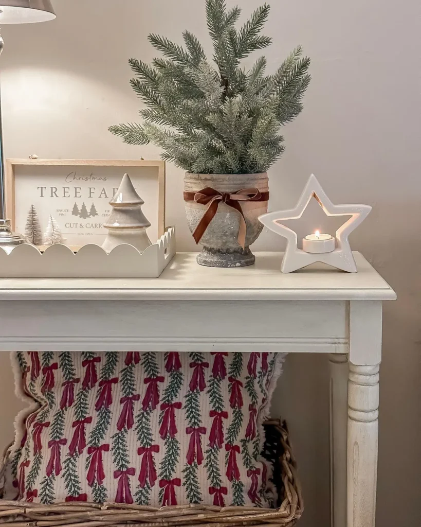 Add greenery. A garland or small frosted tree adds that fresh, festive touch.