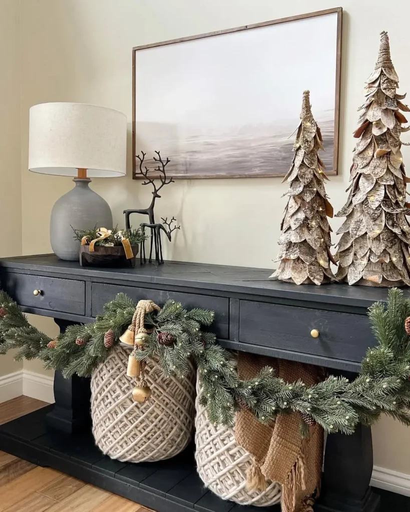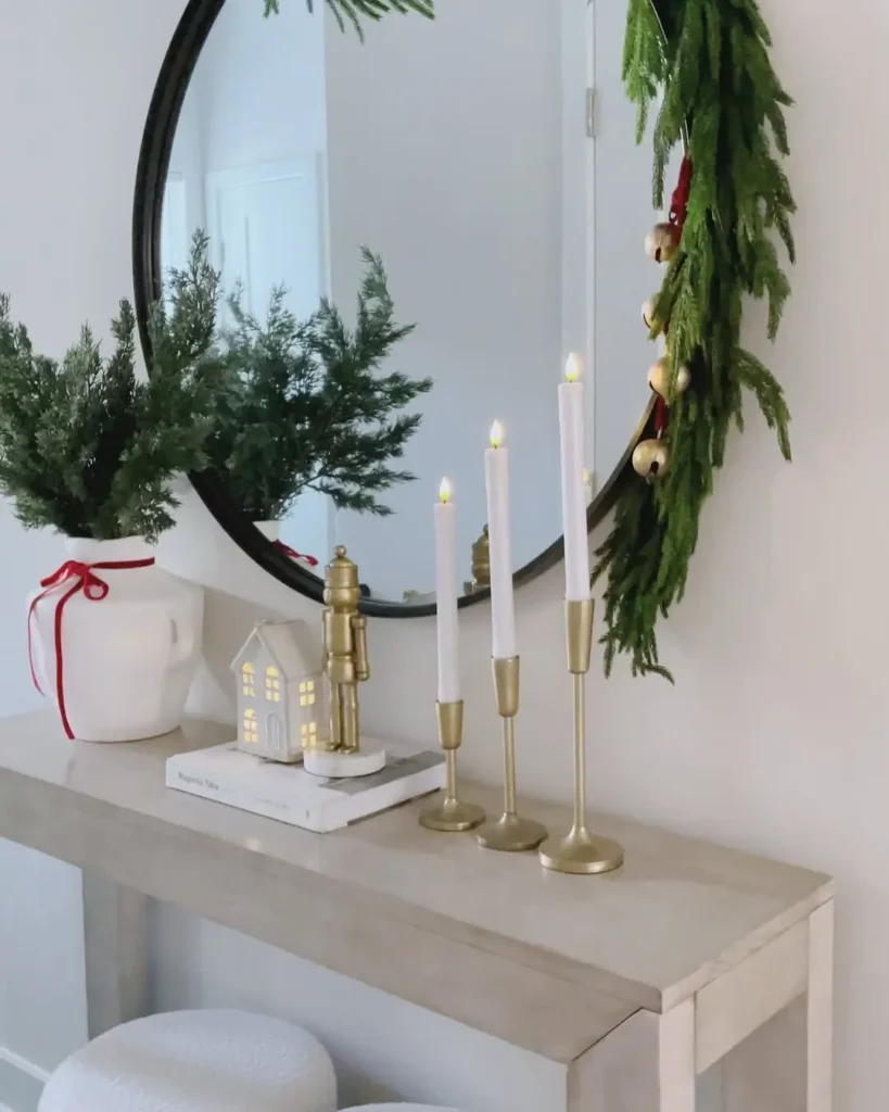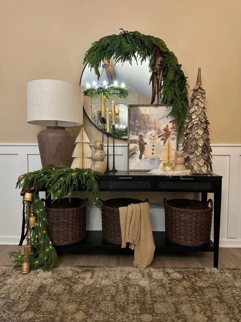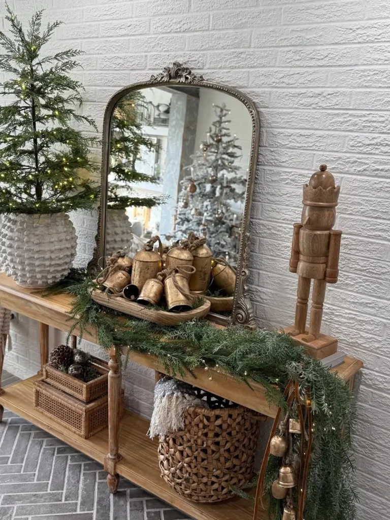 If you’re into cozy farmhouse vibes, this one’s for you. A cute dough bowl filled with rustic bells instantly adds that charming country Christmas feel. Add a wooden nutcracker, maybe some mini pinecones, and drape a garland along the console for that perfectly imperfect touch.