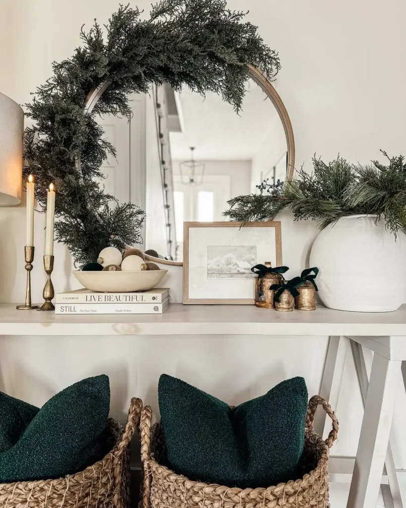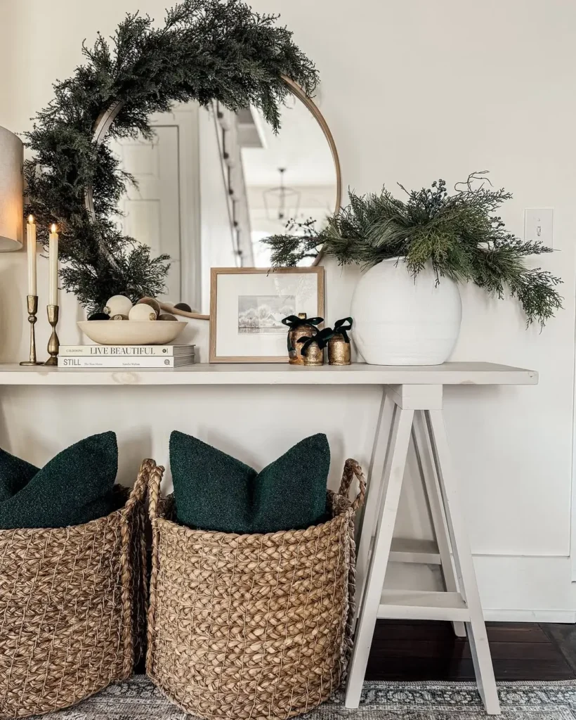 Woven baskets with green throw pillows or cozy blankets underneath the console tie everything together. And if you have the space, add a small Christmas tree next to the table. Nothing too flashy, just enough to bring a little green magic to the space.