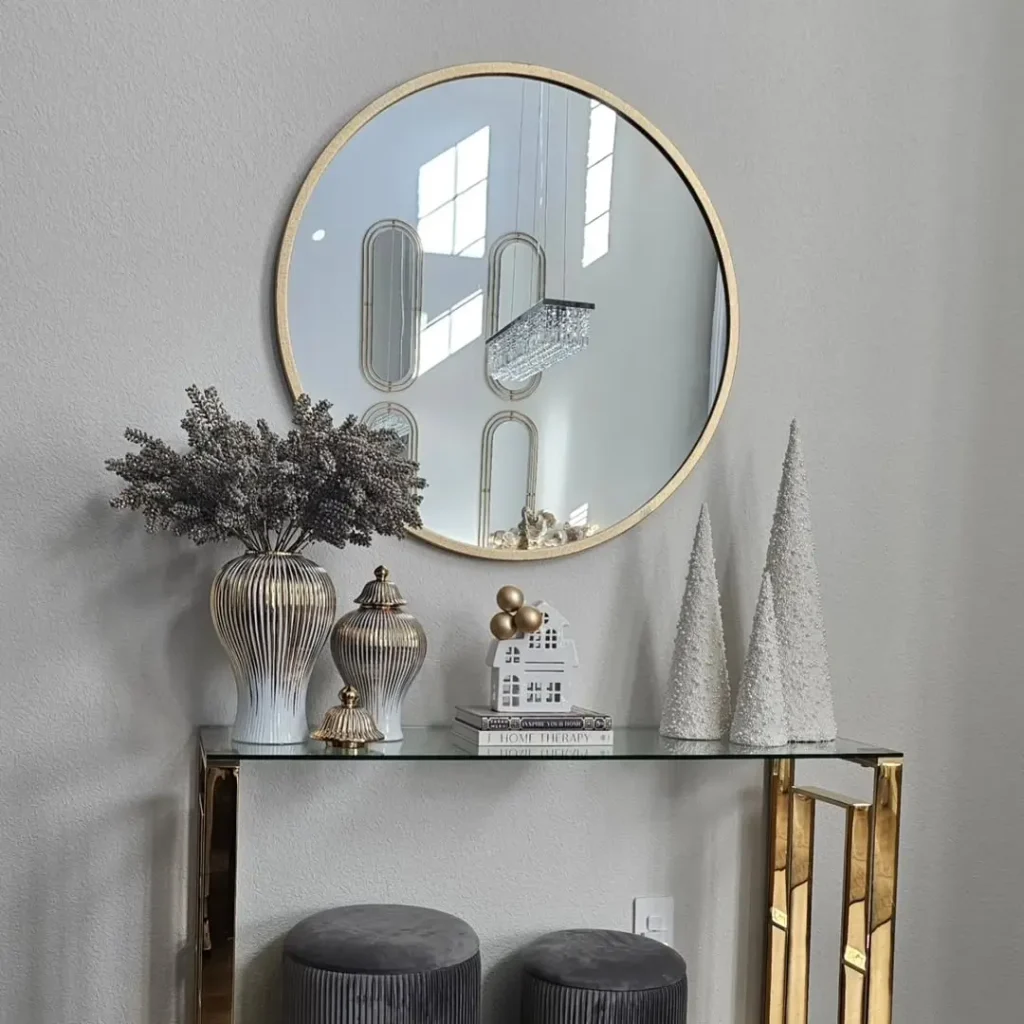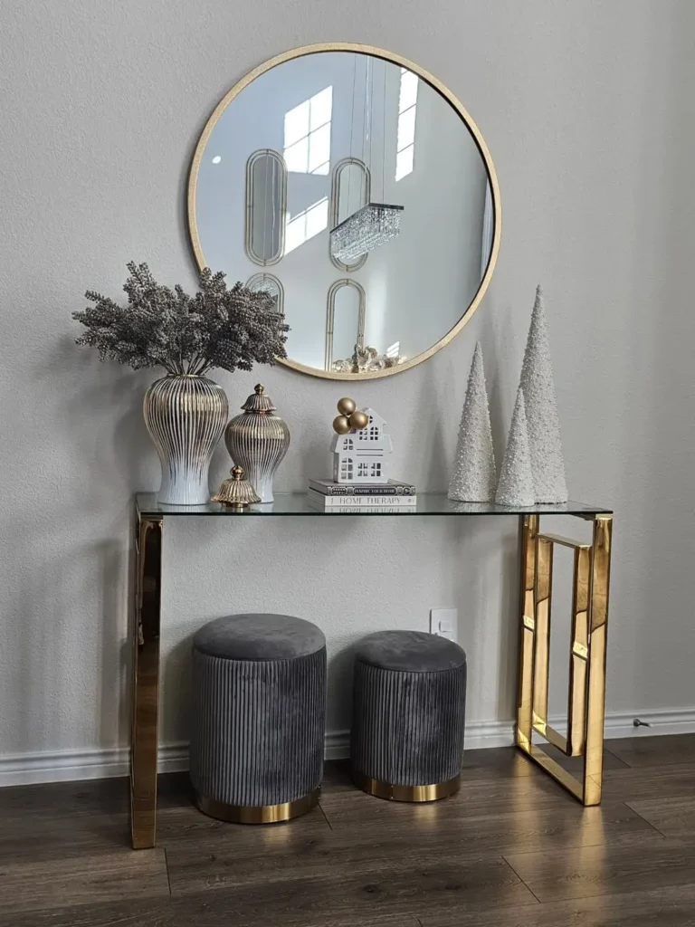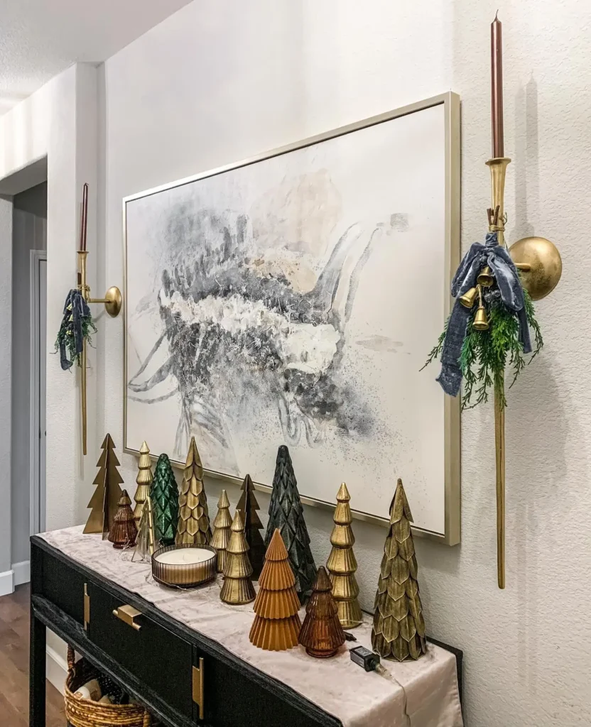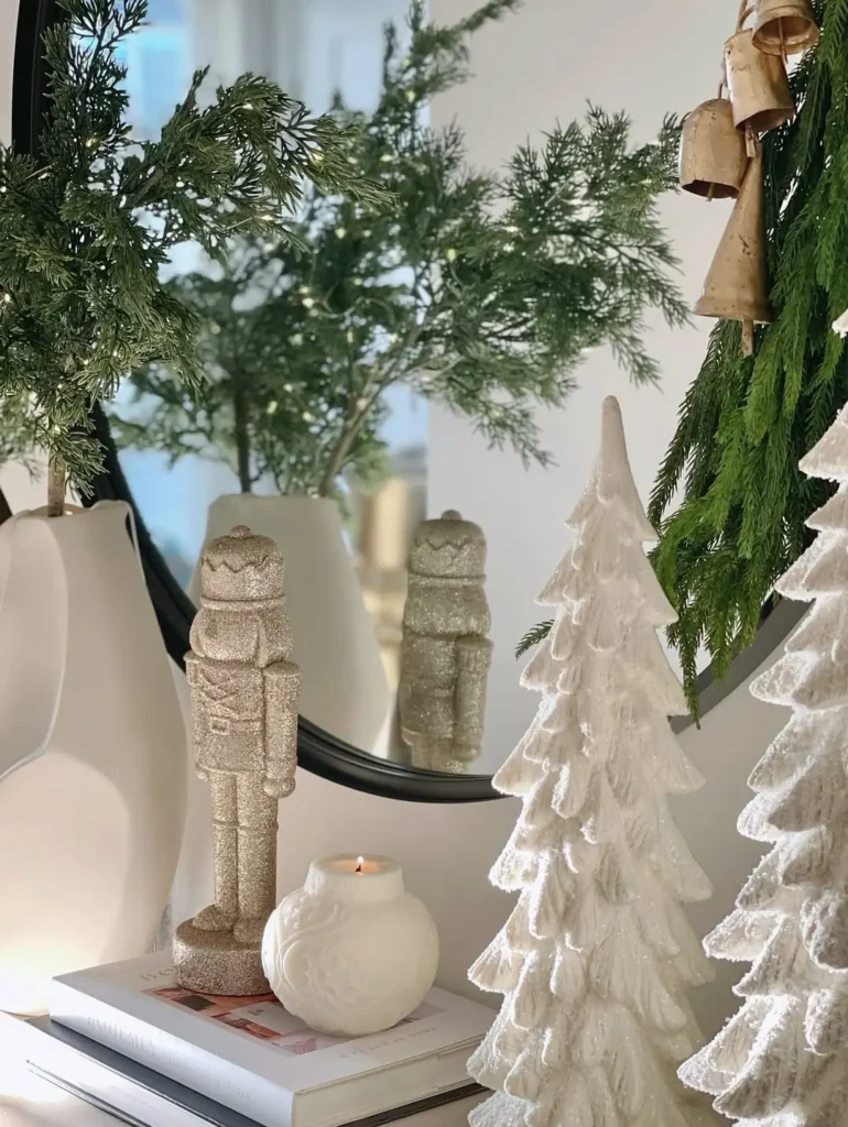 This stunning modern setup is a dream. Picture this: white cone tabletop trees, a sleek glass console table with a gold frame, and a beautiful round mirror hanging above it. Add a few white ceramic porcelain houses and you’ve got yourself a modern winter wonderland.