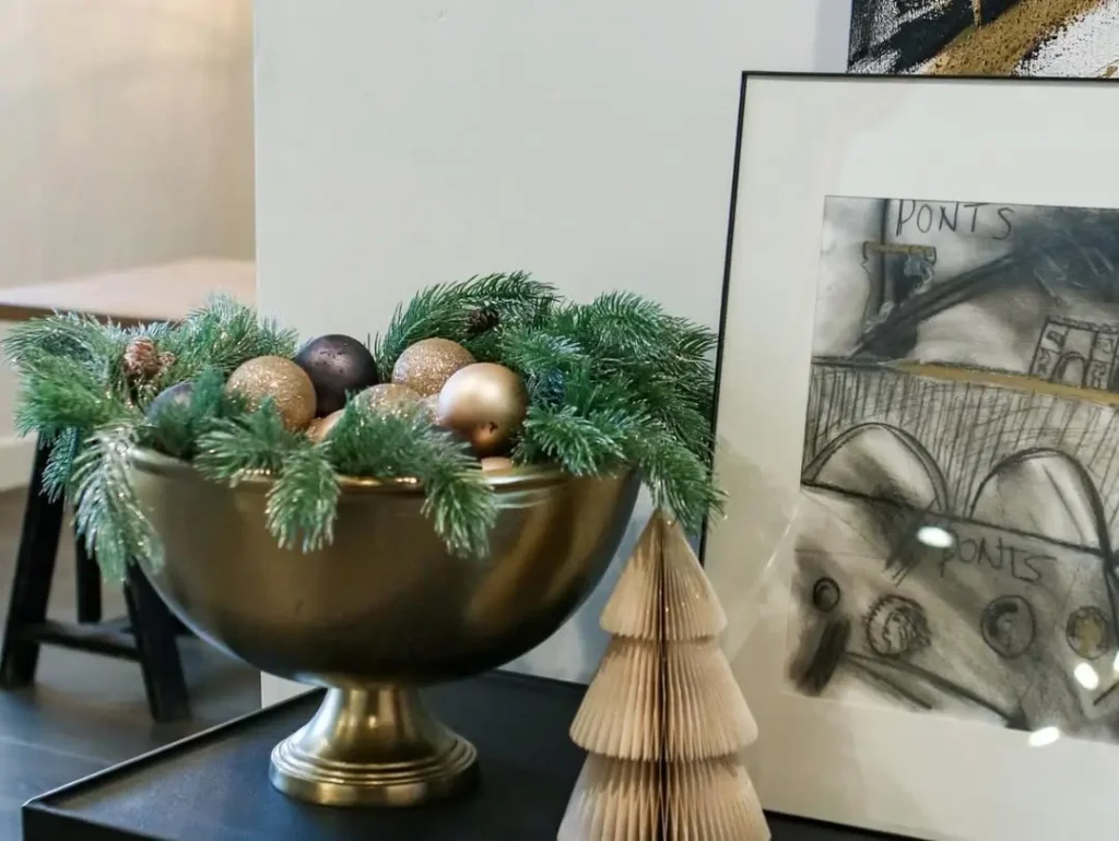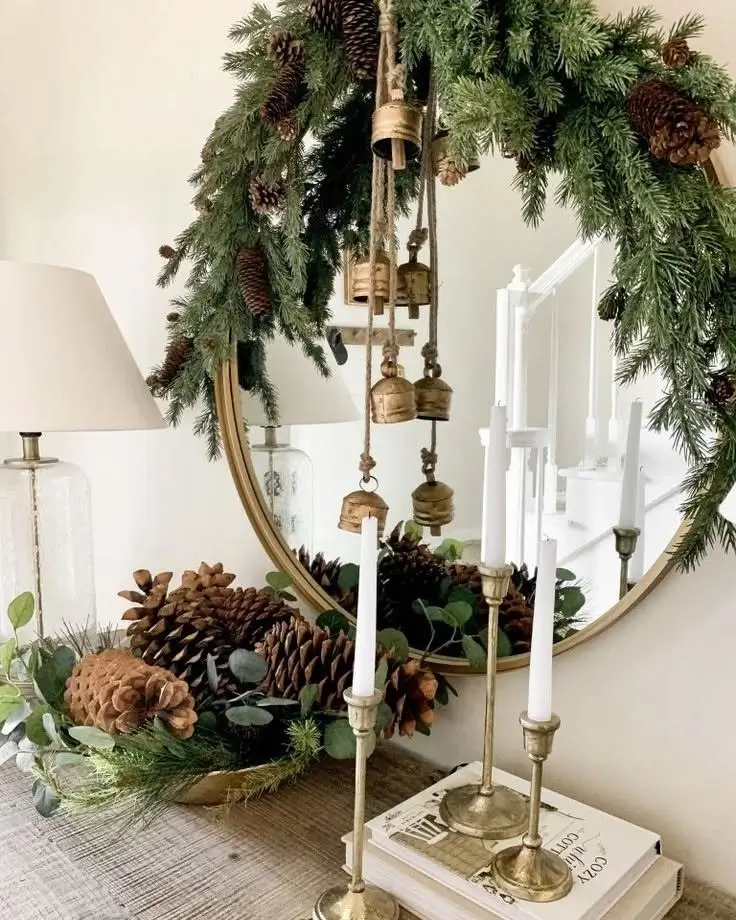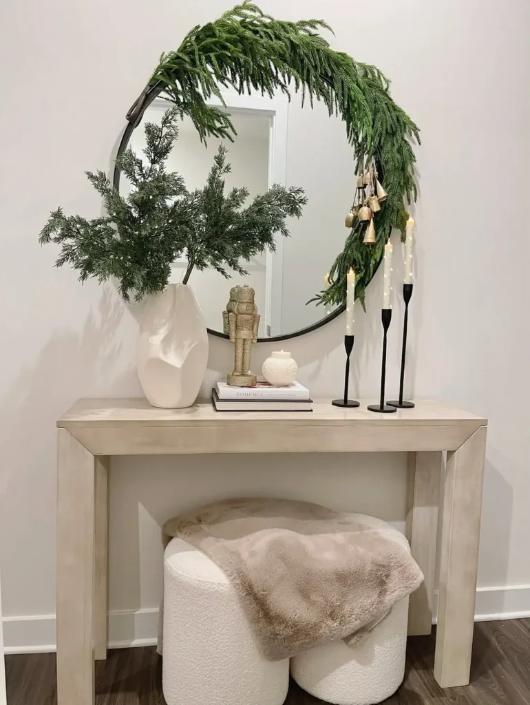 Green is seriously underrated when it comes to white or beige setups. It’s fresh, elegant, and effortlessly Christmassy. Add a garland around your mirror, place a few green branches in a vase, and tie black bows on your decorative bells for a pop of contrast.