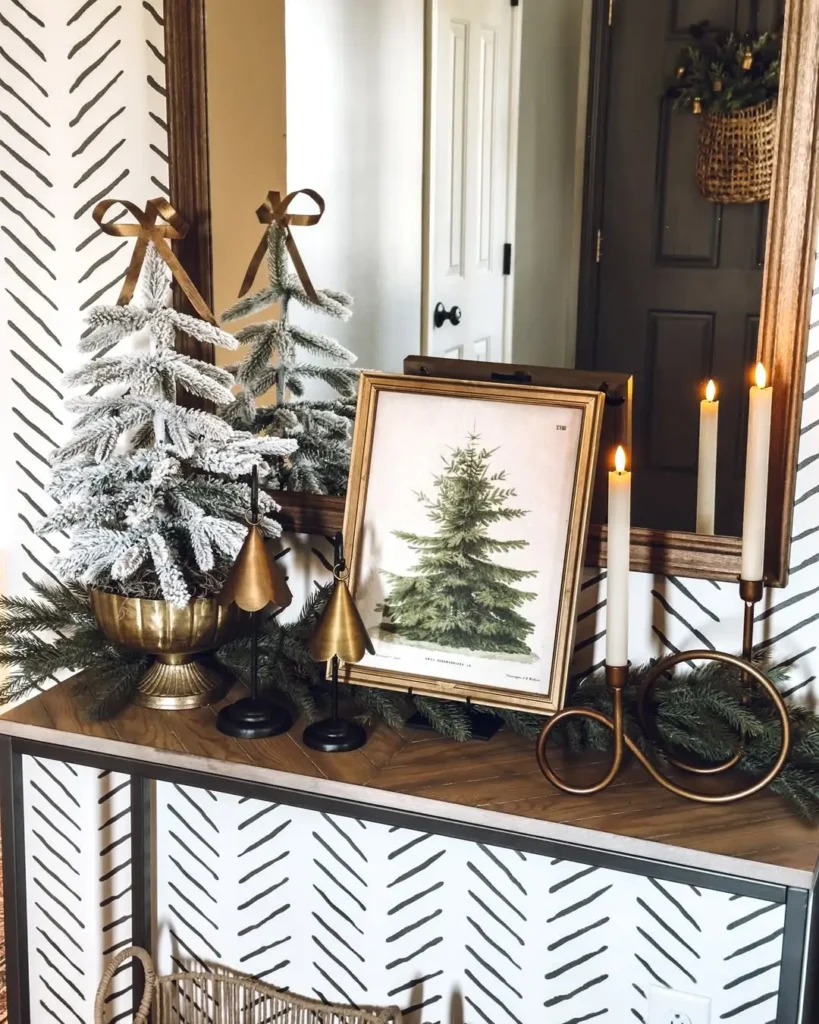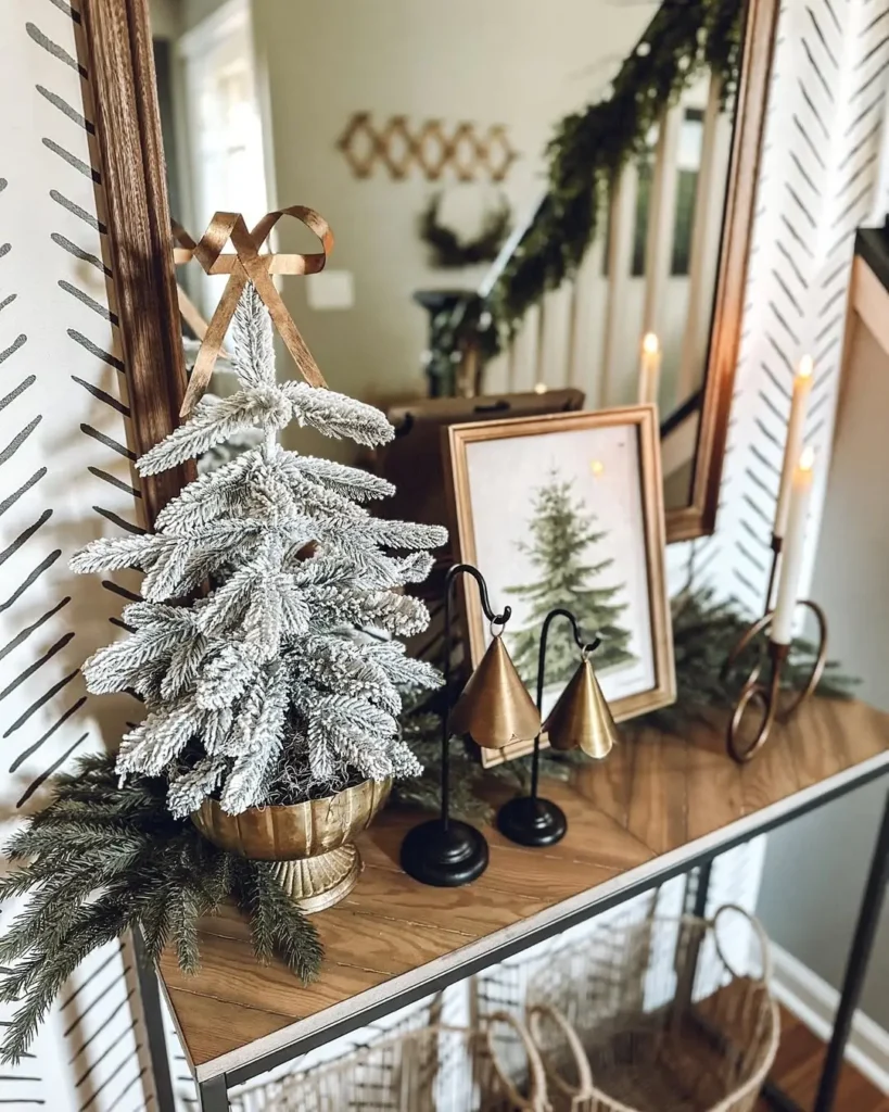 This might just be my favorite. The setup by @lizzydesigns features a small frosted tabletop tree sitting in a brass bowl, with a lush green garland running along the console. The brass tones tie perfectly with the mirror and candle holders, giving it that chic, cohesive look.