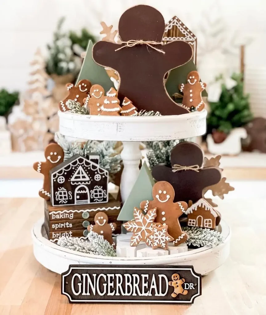 Tiered trays are basically a blank canvas for holiday décor. I’m obsessed with the gingerbread man tiered tray that @birchlanebyjennifer styled.