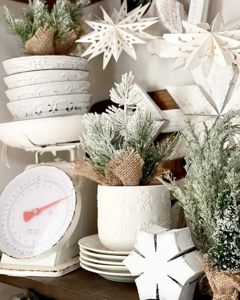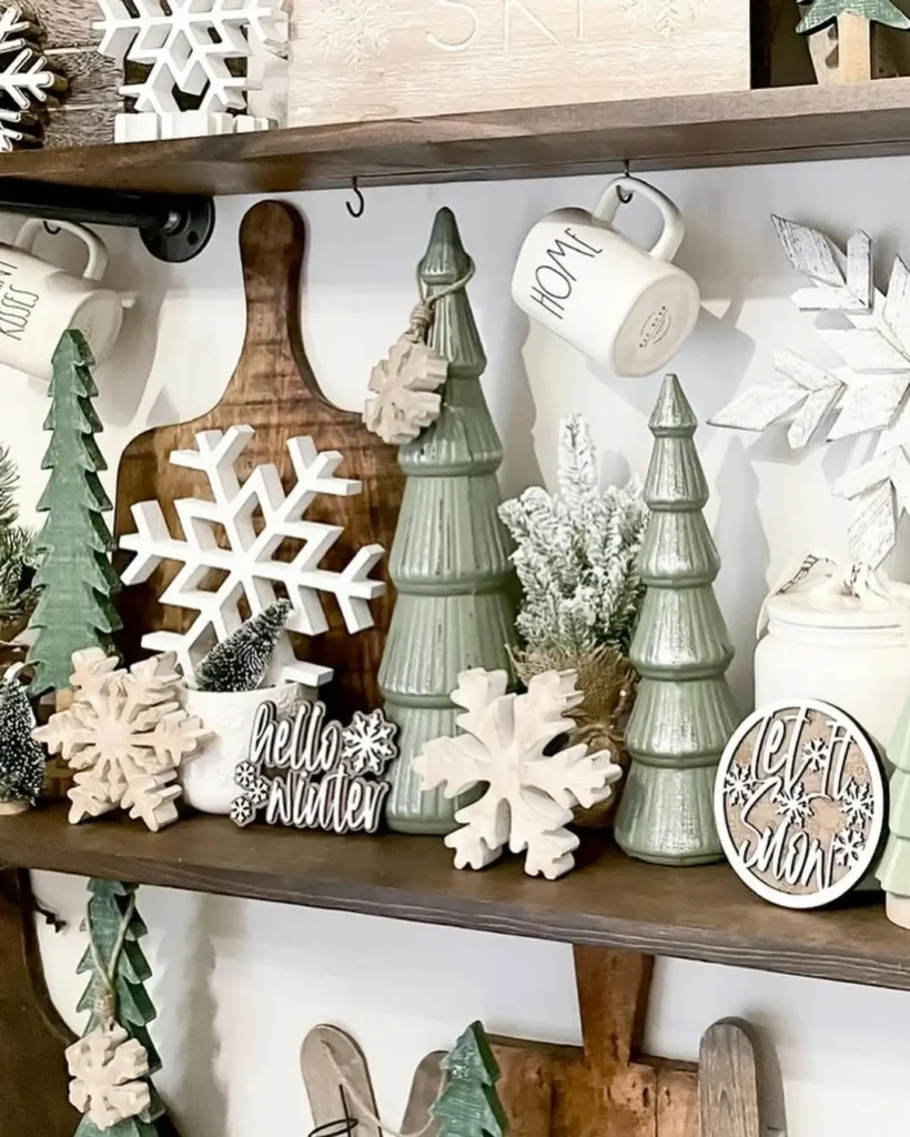Wooden snowflakes are such an easy addition. Hang them from cabinet knobs, use them as ornaments on a small tabletop tree, or scatter them across shelves. They add rustic charm without pulling away from a neutral look.