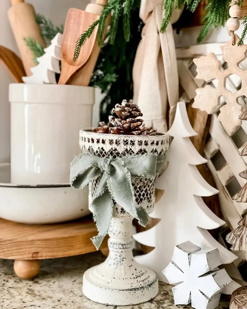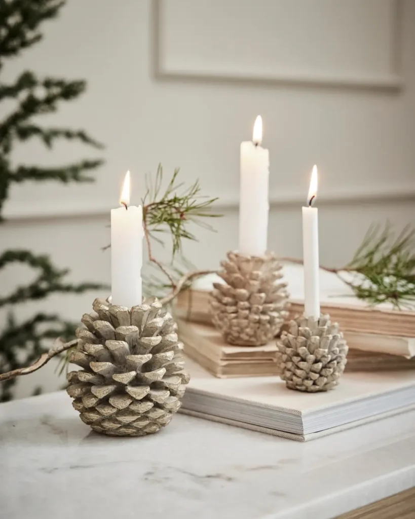 Candlesticks are classic, but swapping them for pinecone candle stands adds texture and that natural winter feel. You can keep them raw and rustic or paint them white for a frosty look.