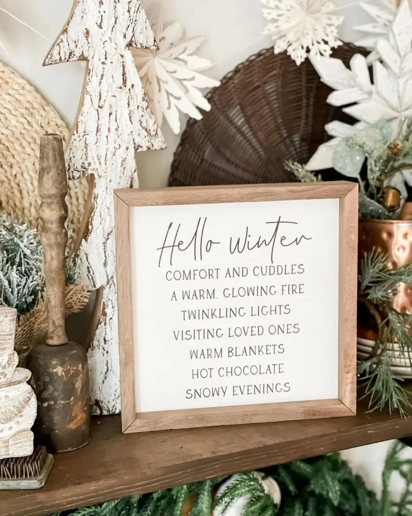 Sometimes the simplest touches make the biggest difference. A small wooden sign with a festive saying , “Merry & Bright” or maybe a Christmas carol placed on an open shelf instantly warms up the space. Pair it with a little greenery and it feels complete.