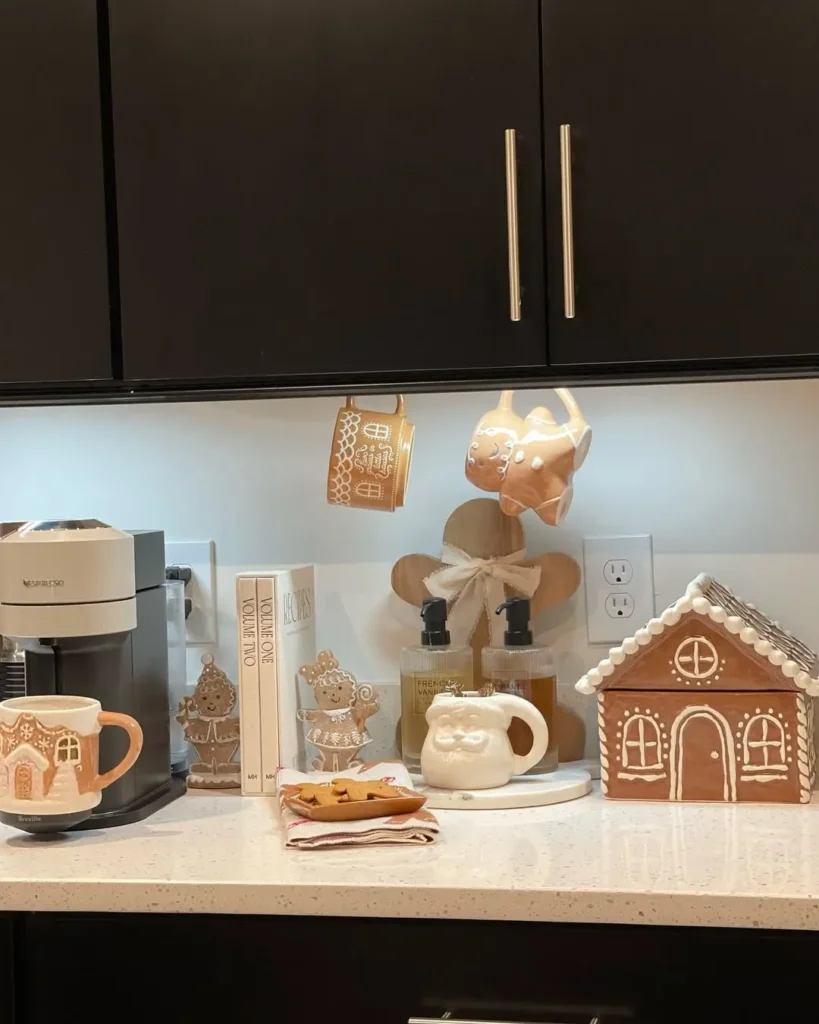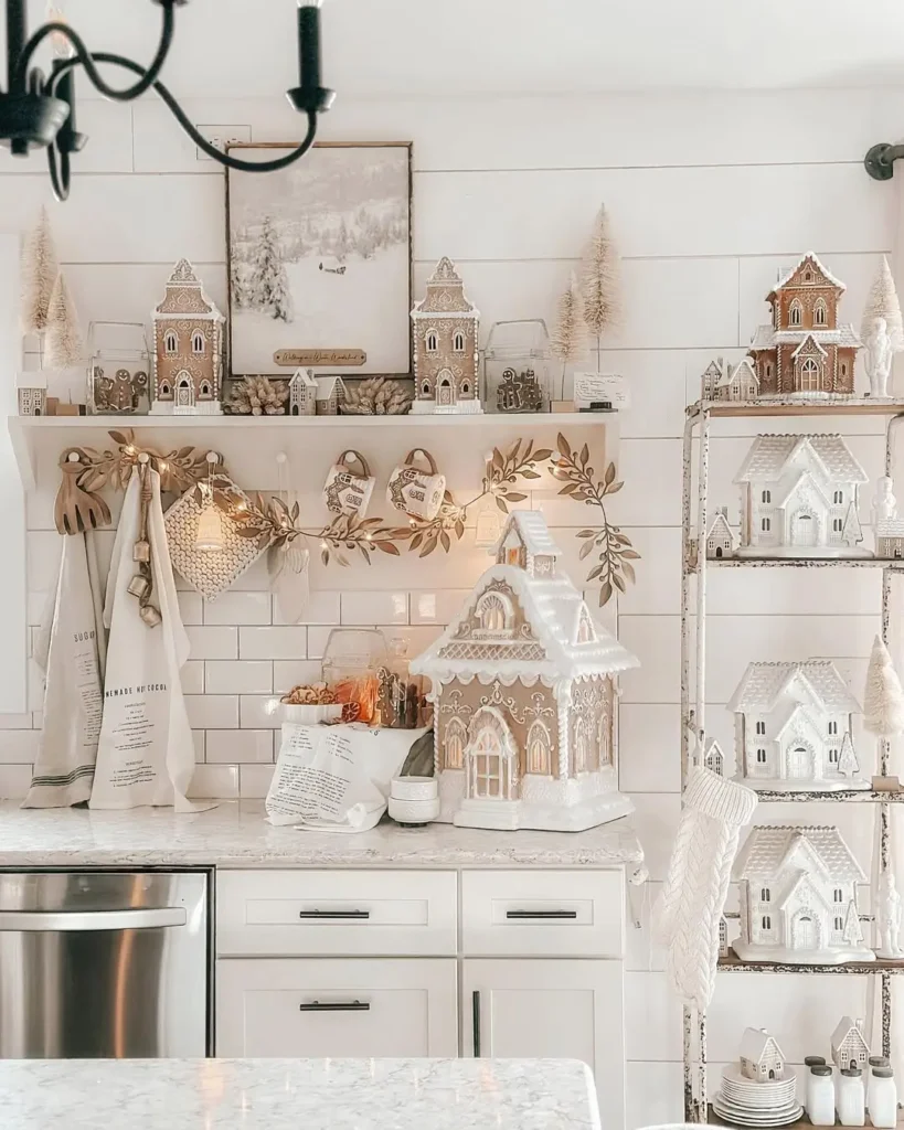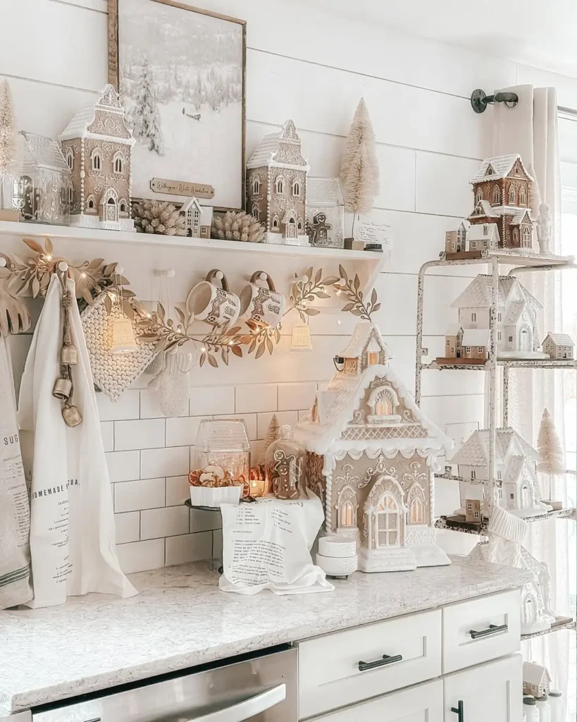 Gingerbread houses aren’t just for kids. You can decorate a few in neutral tones think white icing, natural candy colors, and soft accents and use them as kitchen décor.