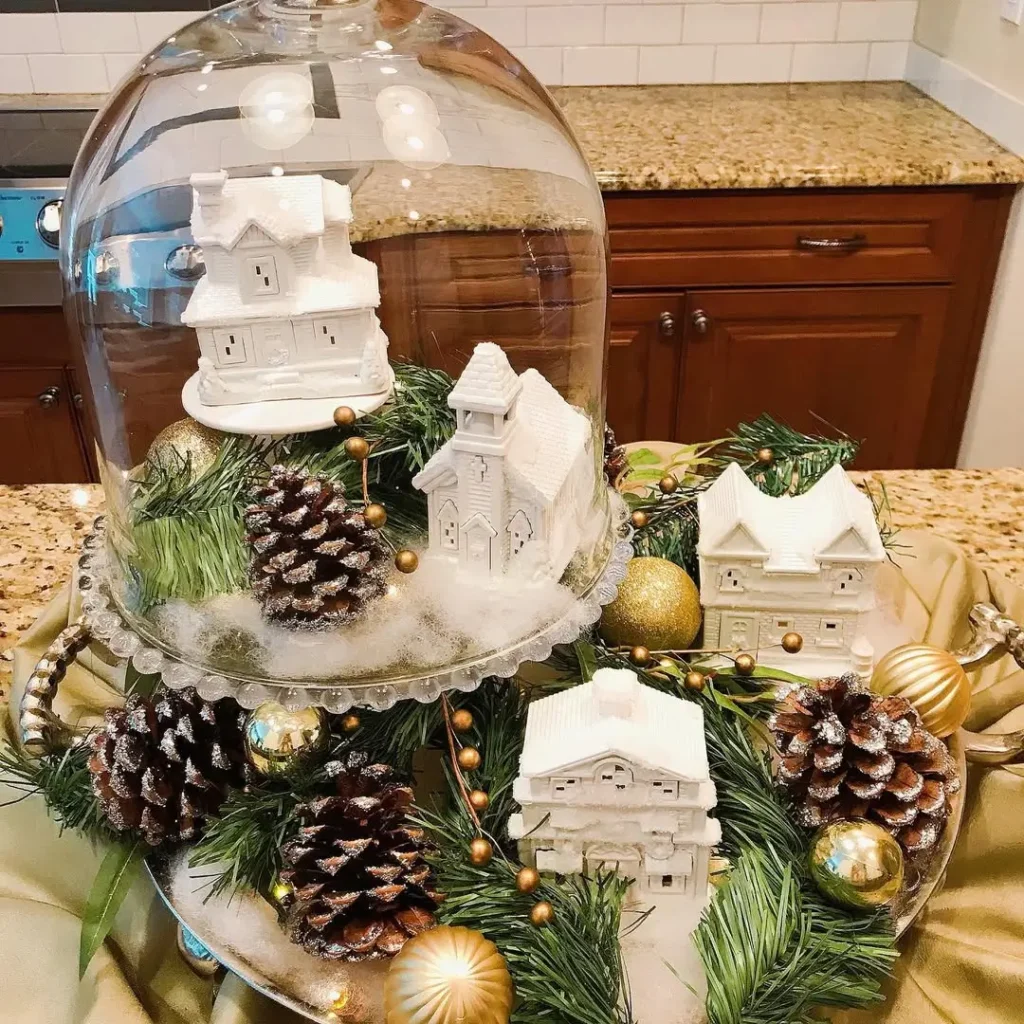 A bowl or tray filled with golden ornaments, pinecones, and candles makes a chic centerpiece that works perfectly in a neutral kitchen. It’s minimal effort but looks polished and festive.