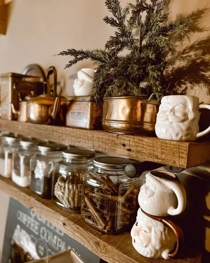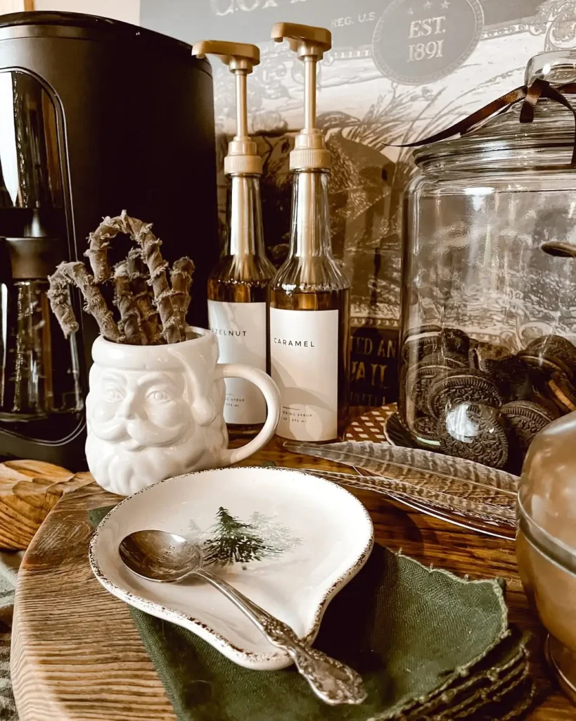 This one is pure joy for me. I love picking out festive mugs, especially white or neutral Santa mugs. I spotted the cutest setup by @shady_pines3interiors with a cozy tea station that had Santa mugs, glass jars for storage, syrup dispensers, a cookie jar, and brass accents.