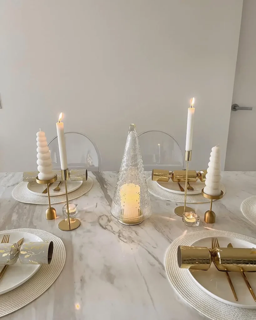 This look is pure quiet luxury. White placemats topped with gold cutlery and simple candlesticks create an airy, elegant base.