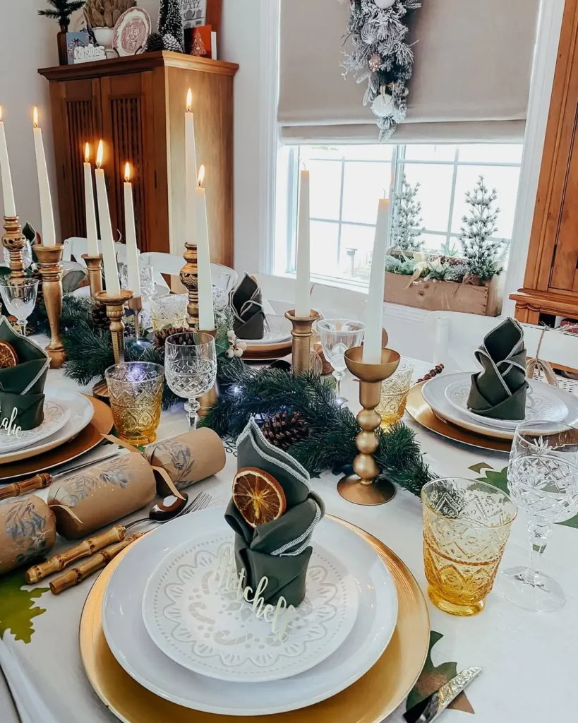The glow of brass candlesticks reflects in crystal glassware, while gold chargers add just the right amount of shimmer. Forest green napkins are topped with dried orange slices, which feels festive without being over the top.