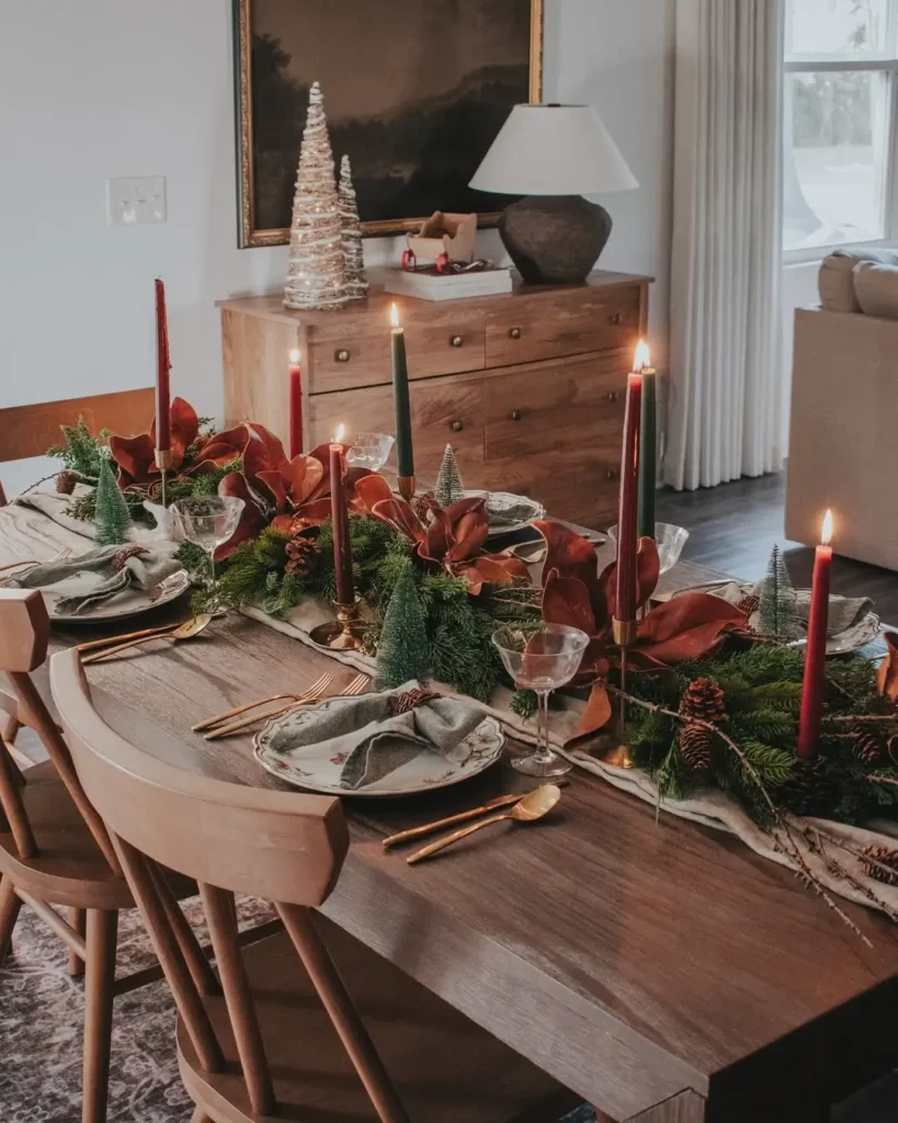 Red and green candles placed in alternating order feel bold but balanced, adding warmth to the whole setting.