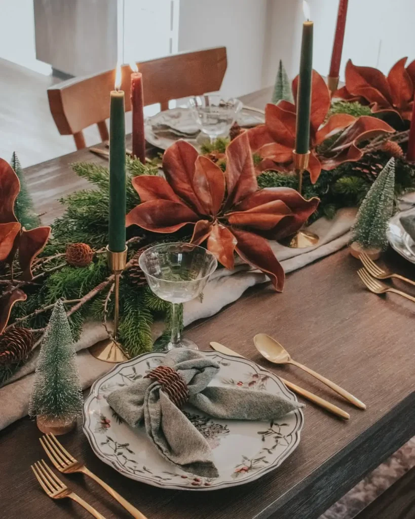 If you love a cozy and rustic look, this earthy tablescape by @athomewith_grace hits the mark. A garland laced with large magnolia flowers gives it richness and texture, while copper accents in the cutlery and candlesticks tie the look together.