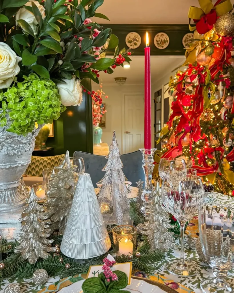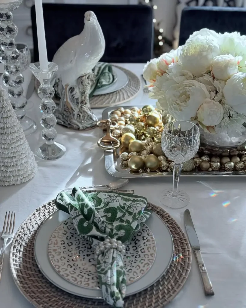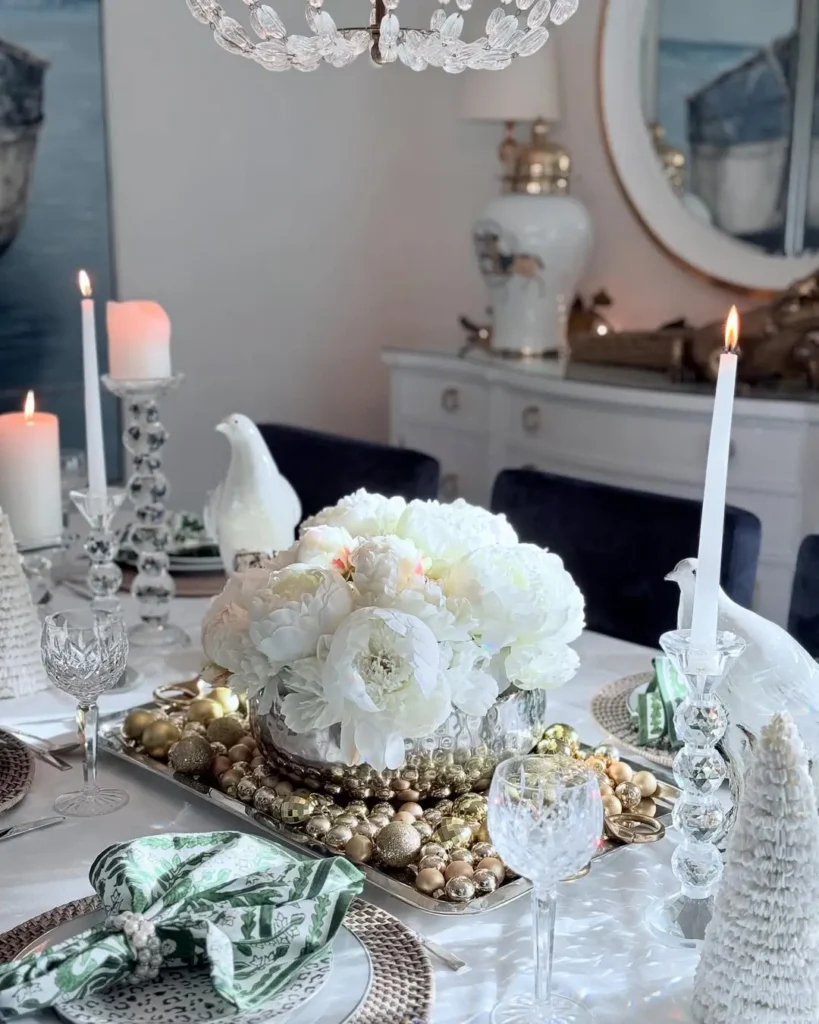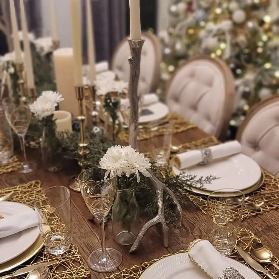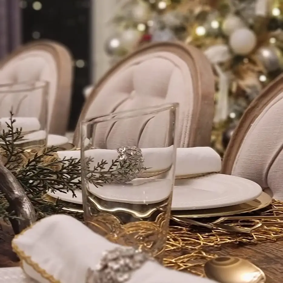 When paired with a simple greenery runner or neutral linens, the look balances sparkle with sophistication. It feels like holiday luxury made easy, and it works beautifully for both intimate dinners and bigger festive gatherings.
