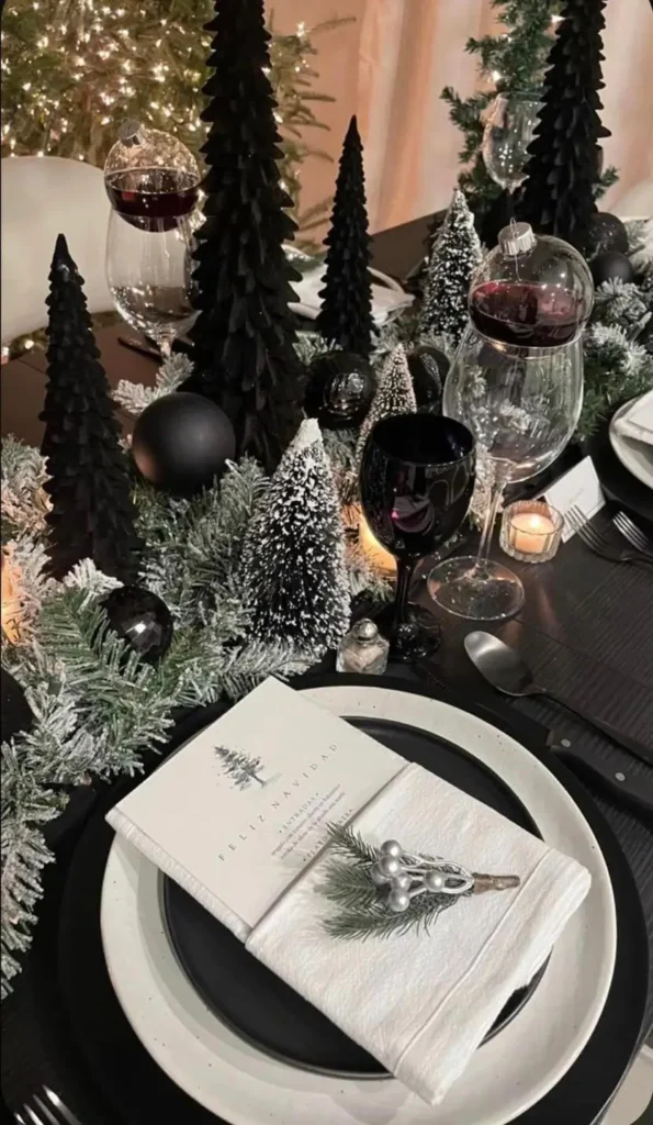 Never in a million years did I think I would love a black Christmas table setting, yet here we are. This dramatic setup features small black Christmas trees in the centerpiece, paired with frosted garlands and glowing candles.