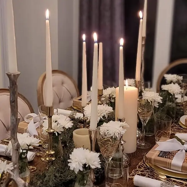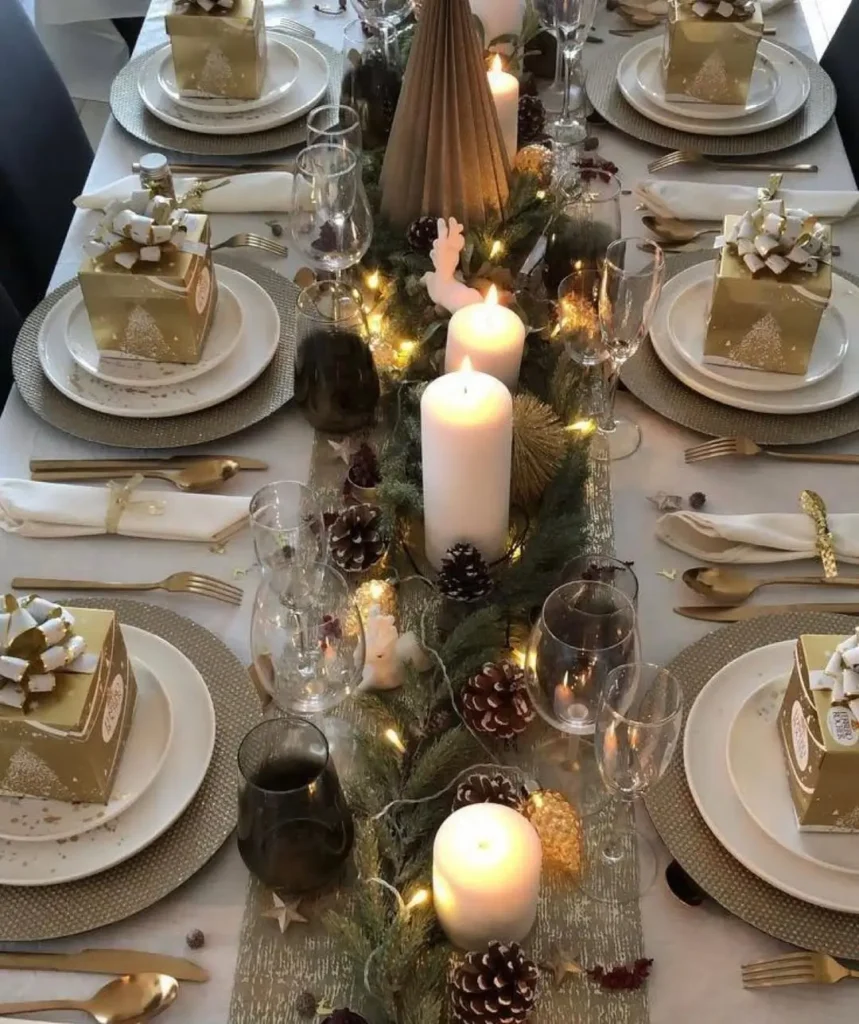 This golden theme leans luxe while still feeling grounded. Gold placemats, candlesticks, and cutlery make a strong statement without overwhelming the table.