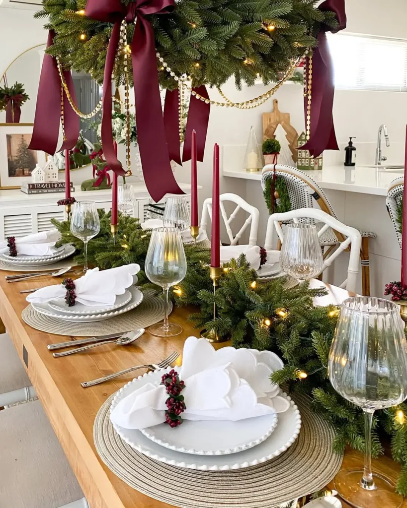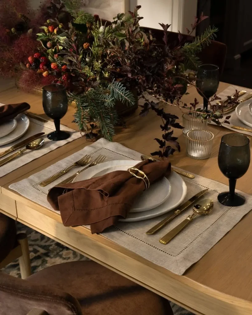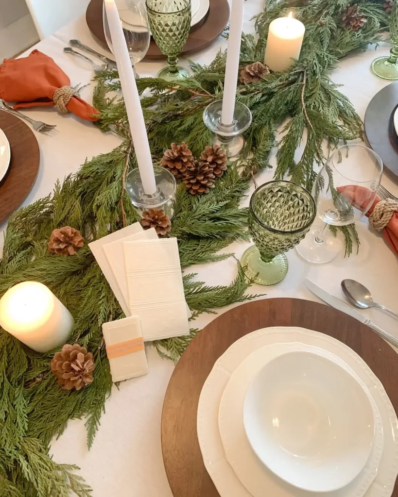 A lush centerpiece garland can anchor the whole table, and little extras like pinecones or fresh herbs tucked into napkin rings bring warmth and texture.