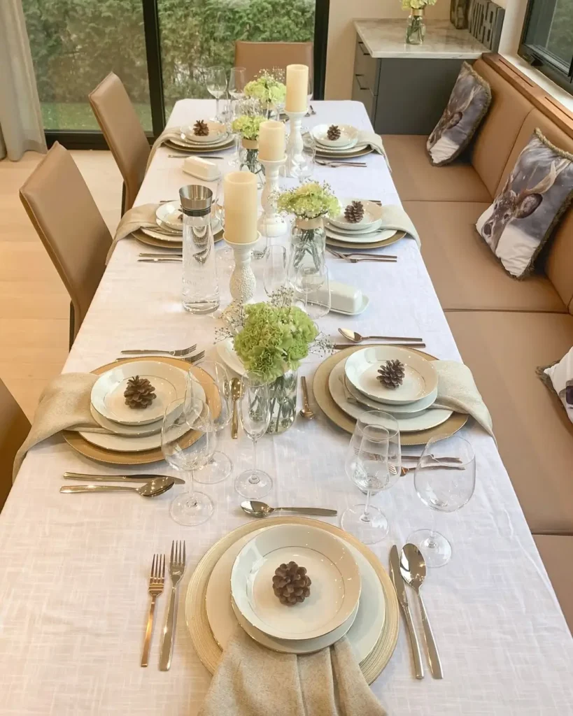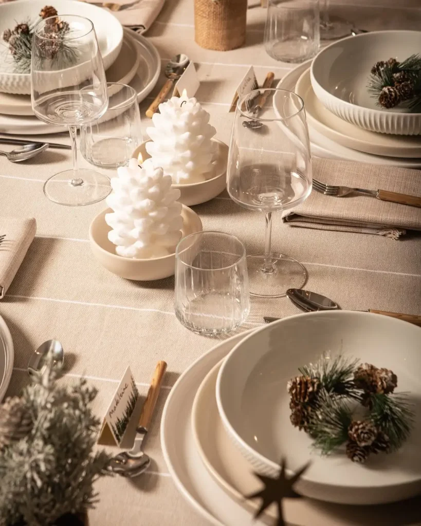 Pinecone-shaped candles add a subtle holiday touch without stealing attention. It is a laid-back style that feels cozy and effortless, perfect for anyone who prefers minimal fuss but still wants a warm, intentional table.
