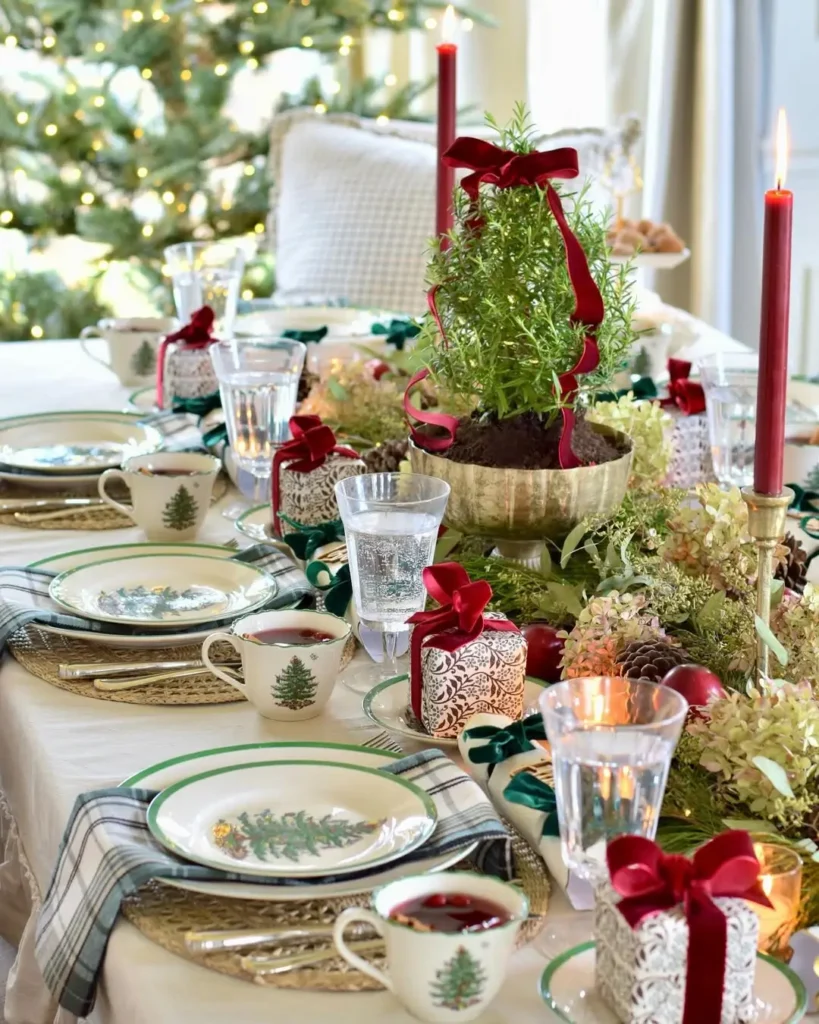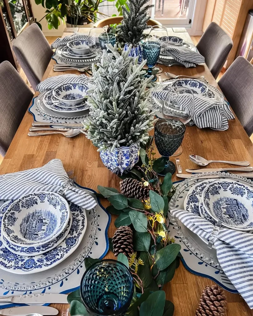A porcelain Christmas tree placed in the center feels playful and charming. This table is cozy yet elegant, with just the right amount of unexpected detail to make people smile.
