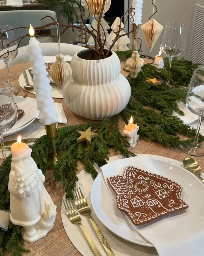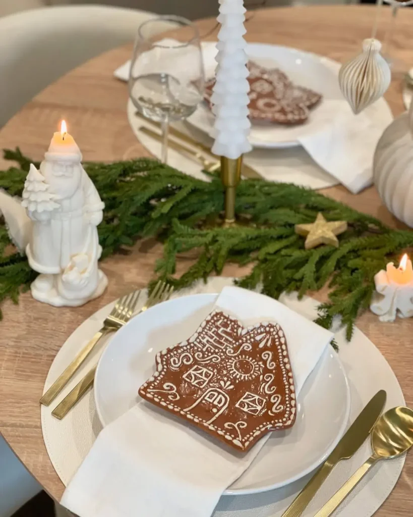 This playful design brings out the child in everyone. Gingerbread-shaped plates sit alongside minimalistic Christmas trees and glowing white candles.