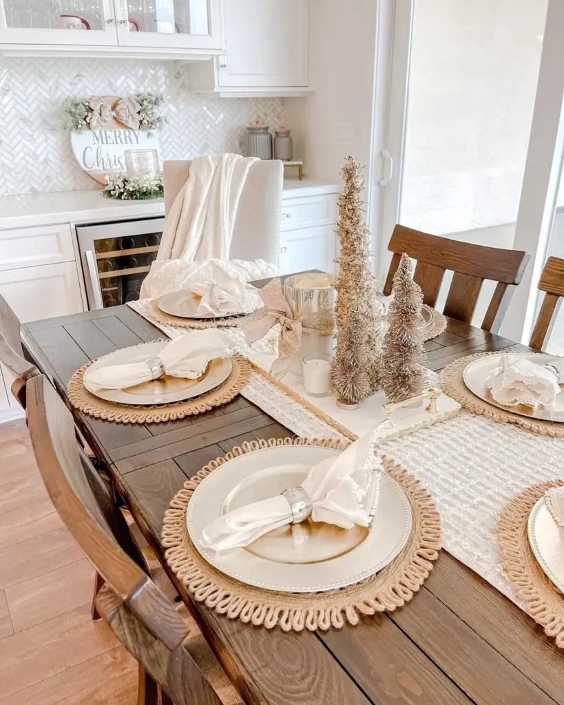 For a softer touch of elegance, beige and champagne tones are beautiful together. Woven placemats paired with champagne chargers create a layered base, while a beige runner runs down the center.