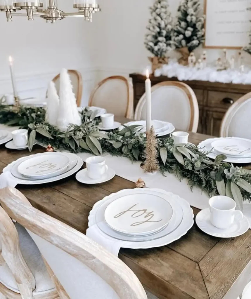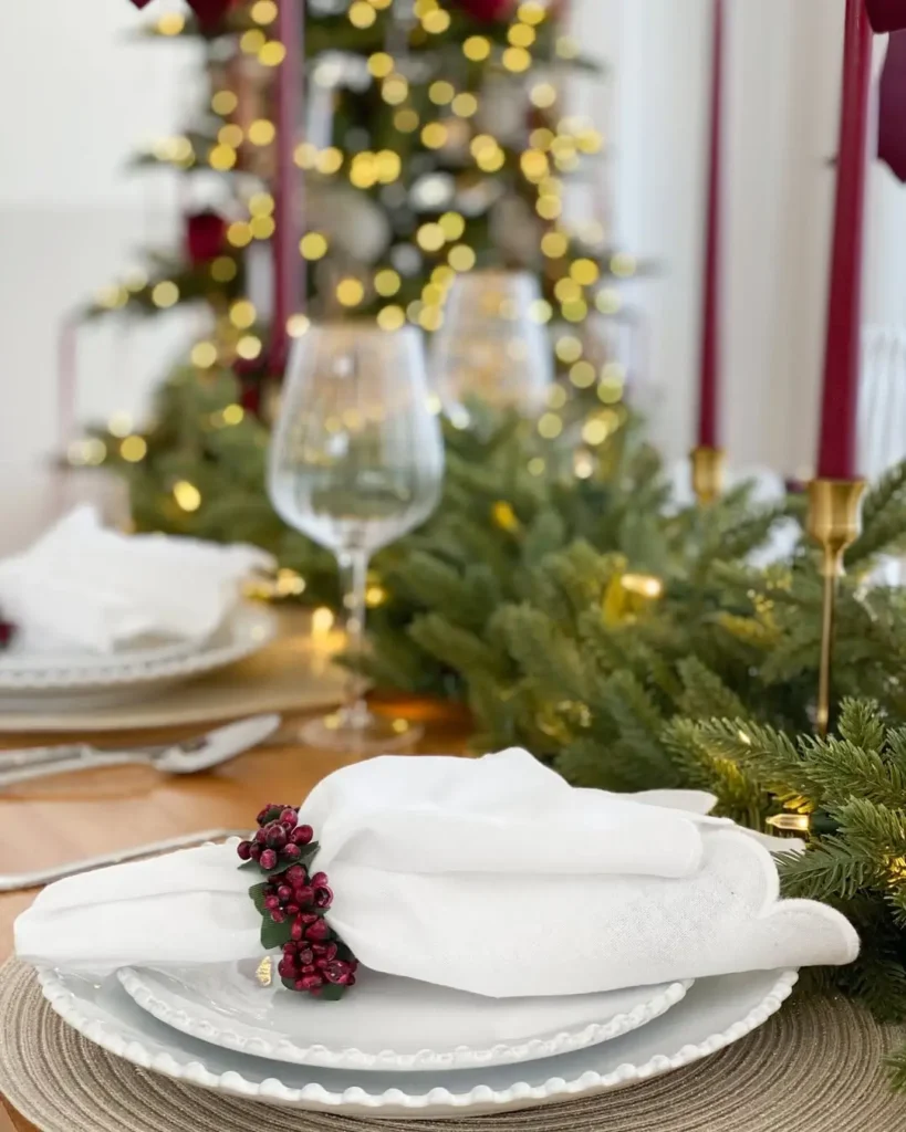 No Christmas table feels complete without a touch of greenery. Add a garland, pine sprigs, or eucalyptus.