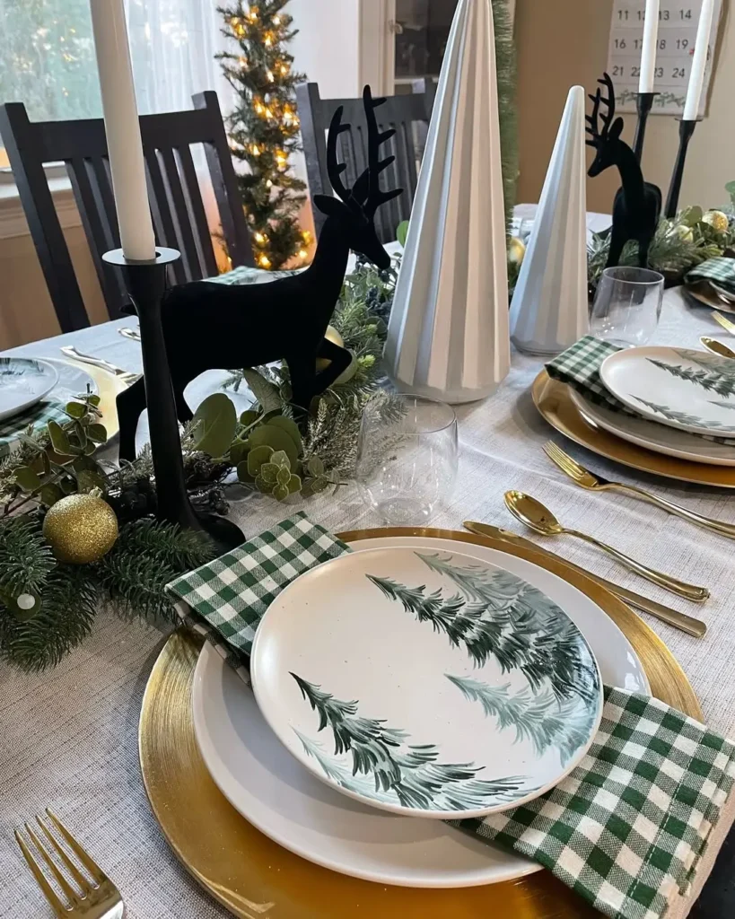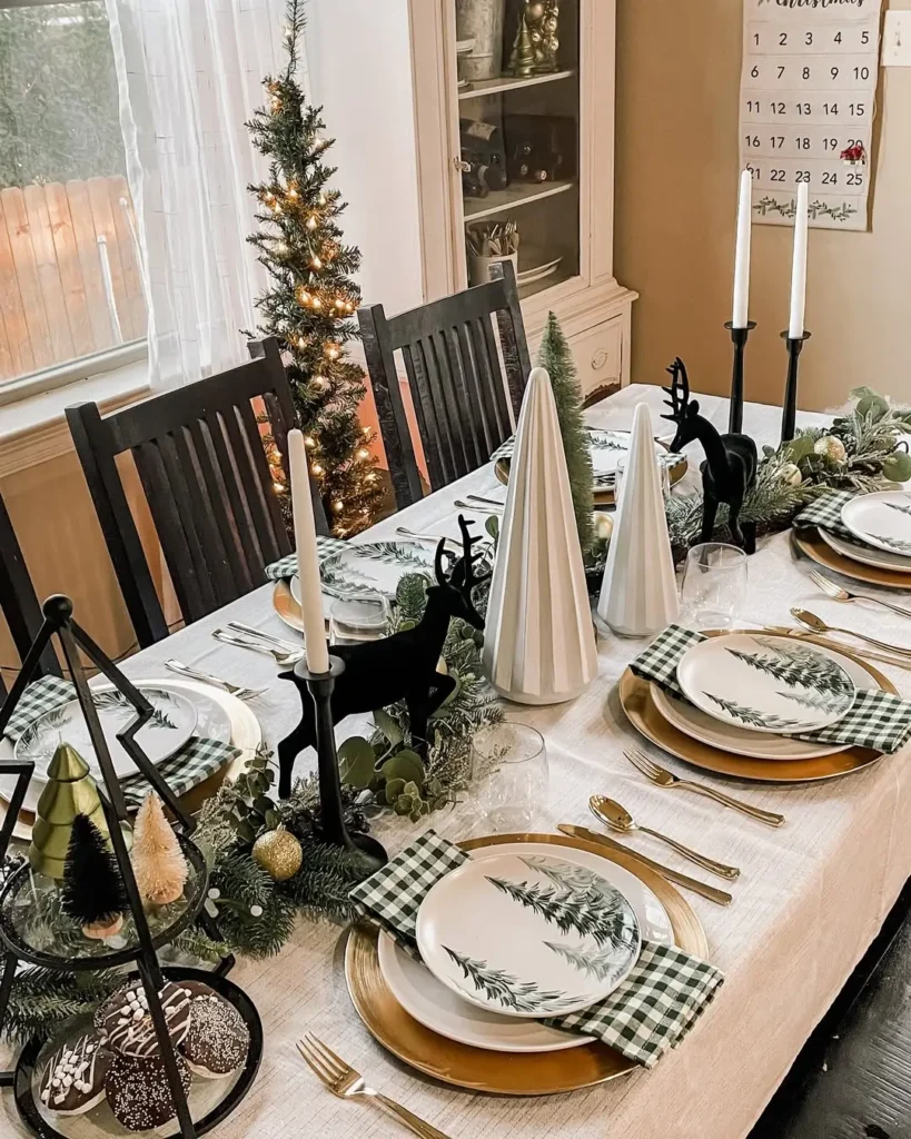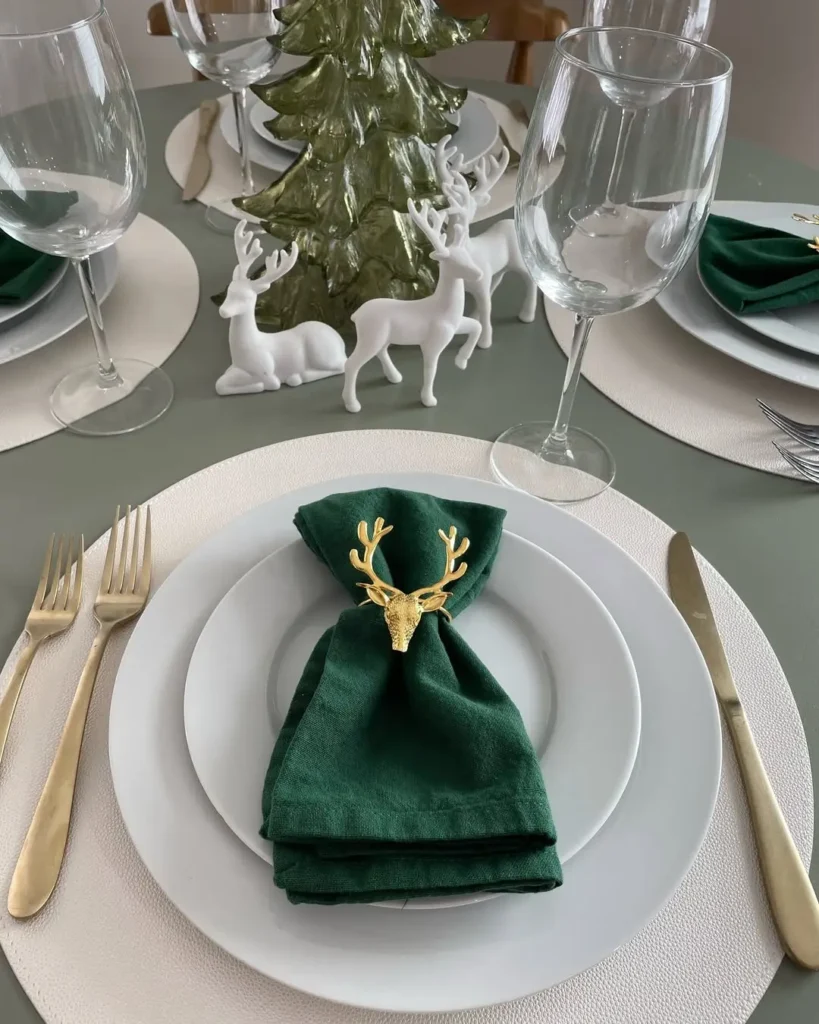 If you love simplicity with a twist, this reindeer-inspired table hits the sweet spot. A sage green tablecloth sets a soft base, topped with white plates and gold reindeer napkin rings.