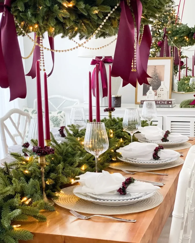 Burgundy brings romance and richness to the holiday table. A neutral base is layered with a green garland centerpiece, burgundy candles, and berry napkin rings.