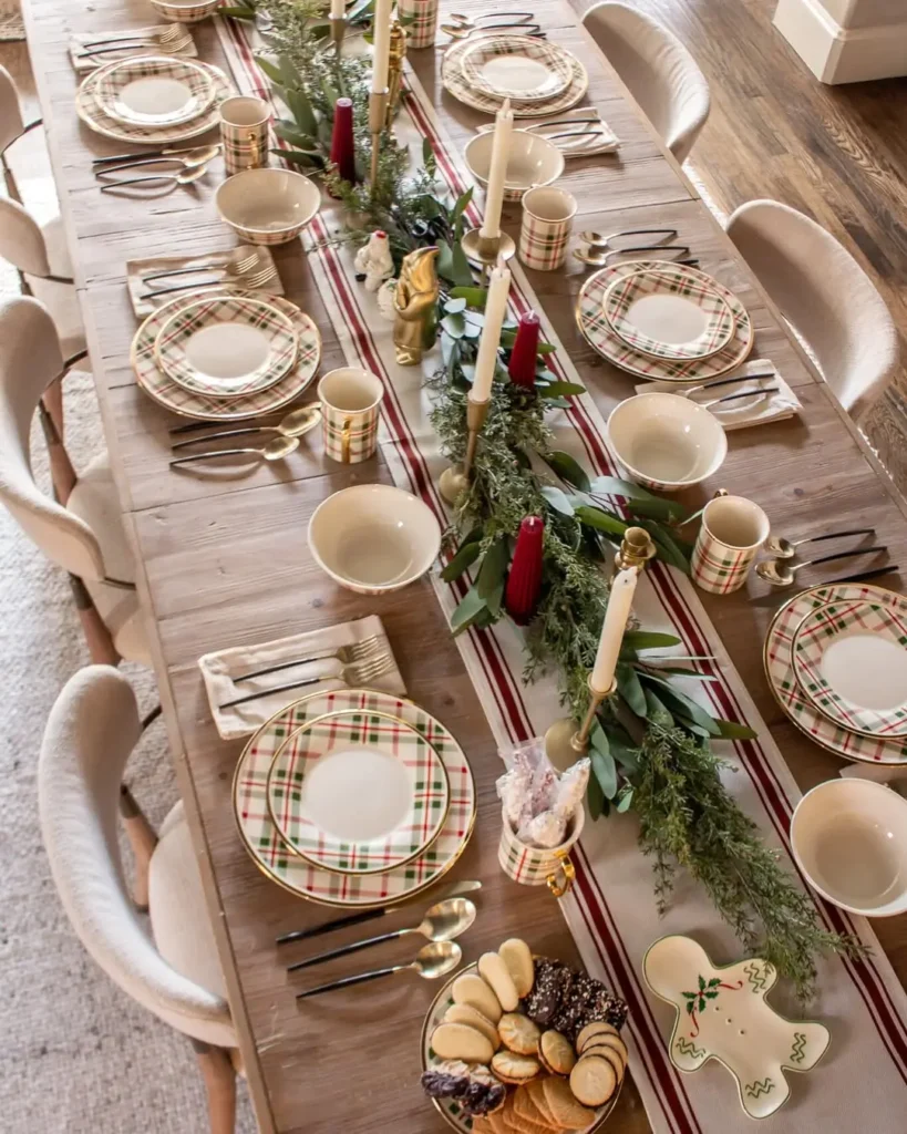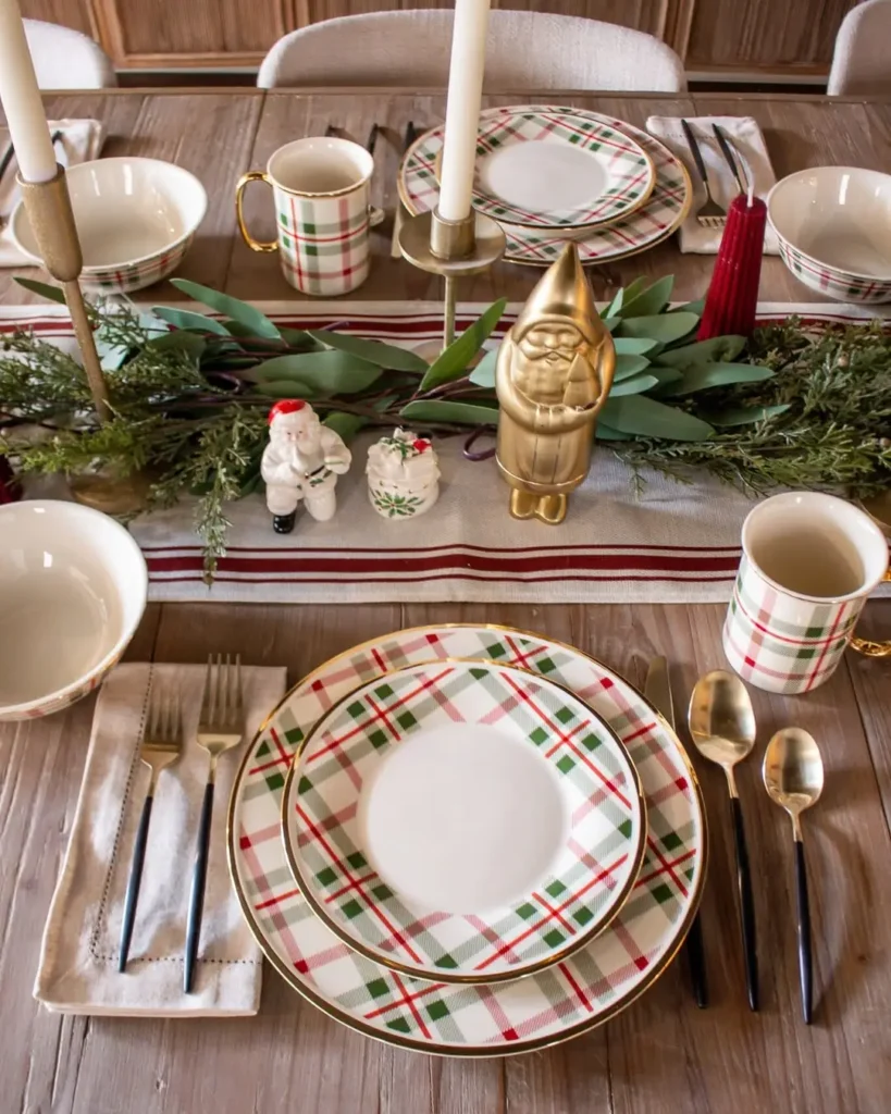 This one is casual and fun. Plaid tableware adds pattern and personality, while a cream runner with a simple garland keeps it grounded.