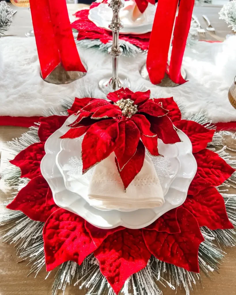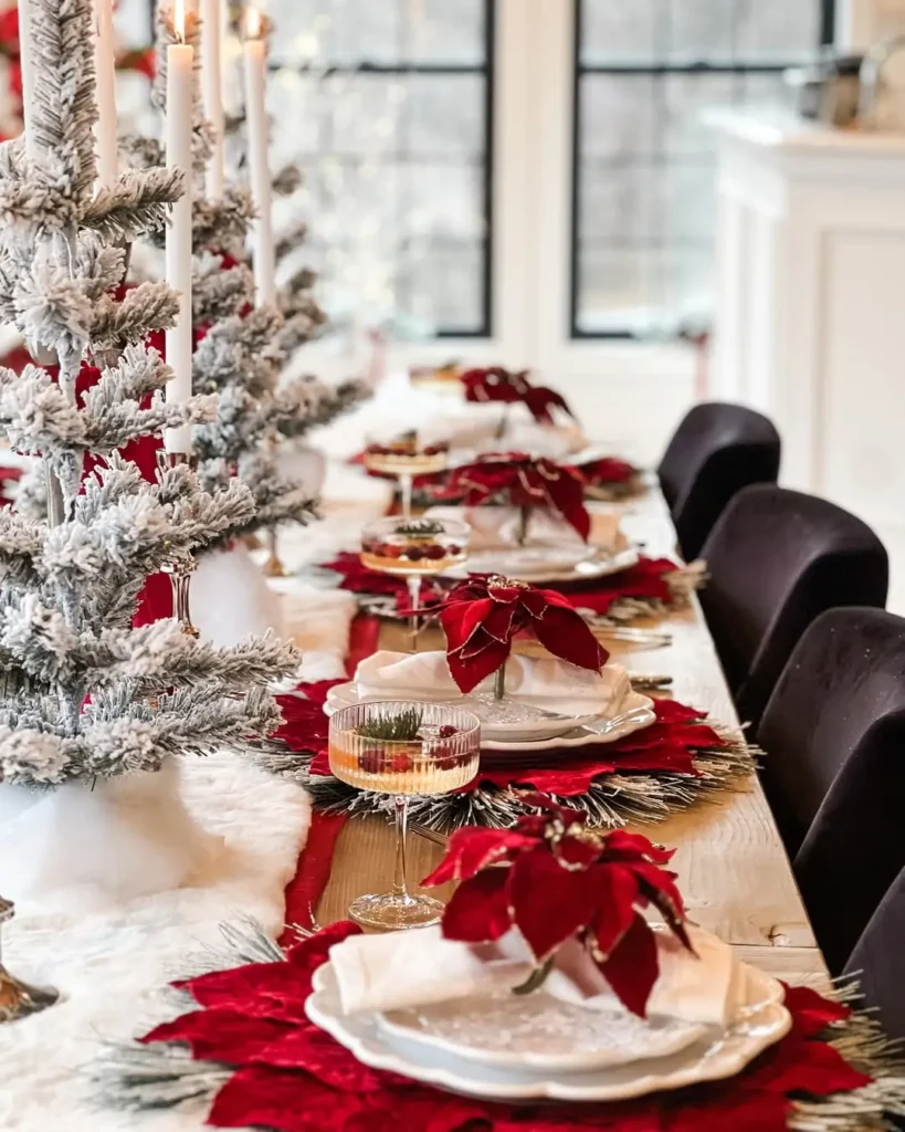 This design leans classic with a twist. Poinsettias take center stage in both ornaments and tabletop décor, while a fluffy white runner softens the look.