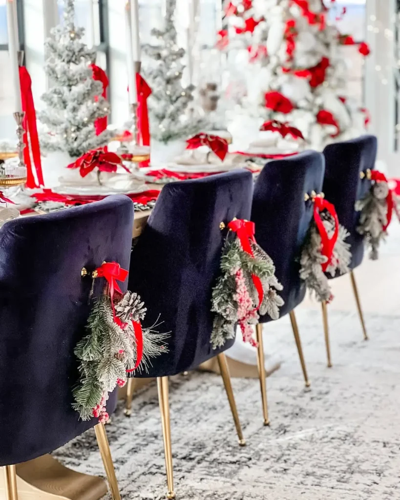 Hanging ribbons add movement and charm, making the whole look feel lush and thoughtful. It is festive without being predictable.