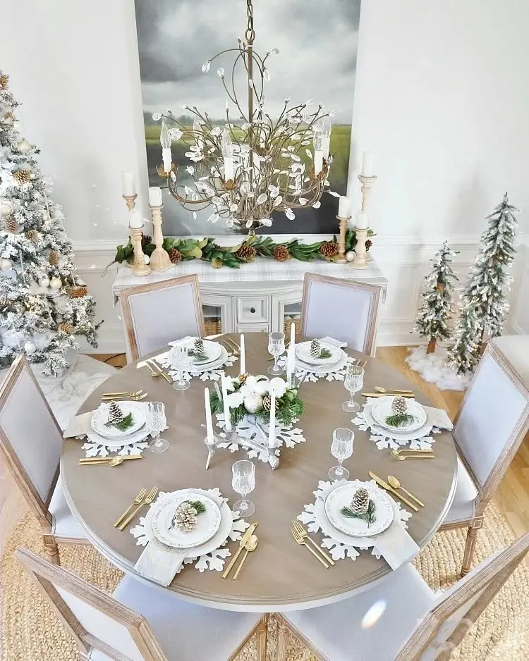 Simple yet striking, this one focuses on details. Snowflake-shaped placemats paired with gold cutlery instantly catch the eye.