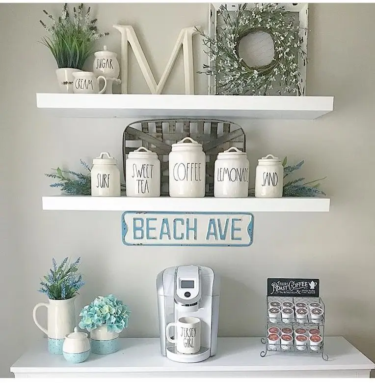 Designed by homesweethome_decor, this coffee bar uses soft blue tones against white shelving for a breezy coastal feel.