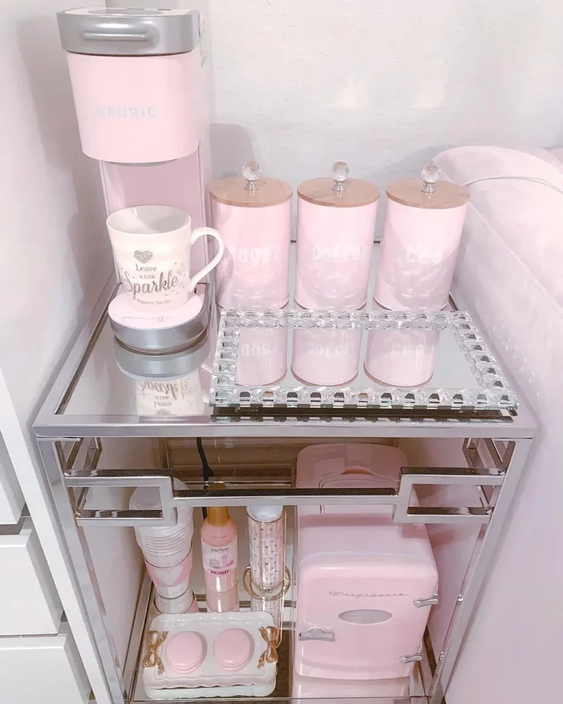 The matching pink Keurig paired with a silver mirrored stand alone unit creates a dreamy focal point.