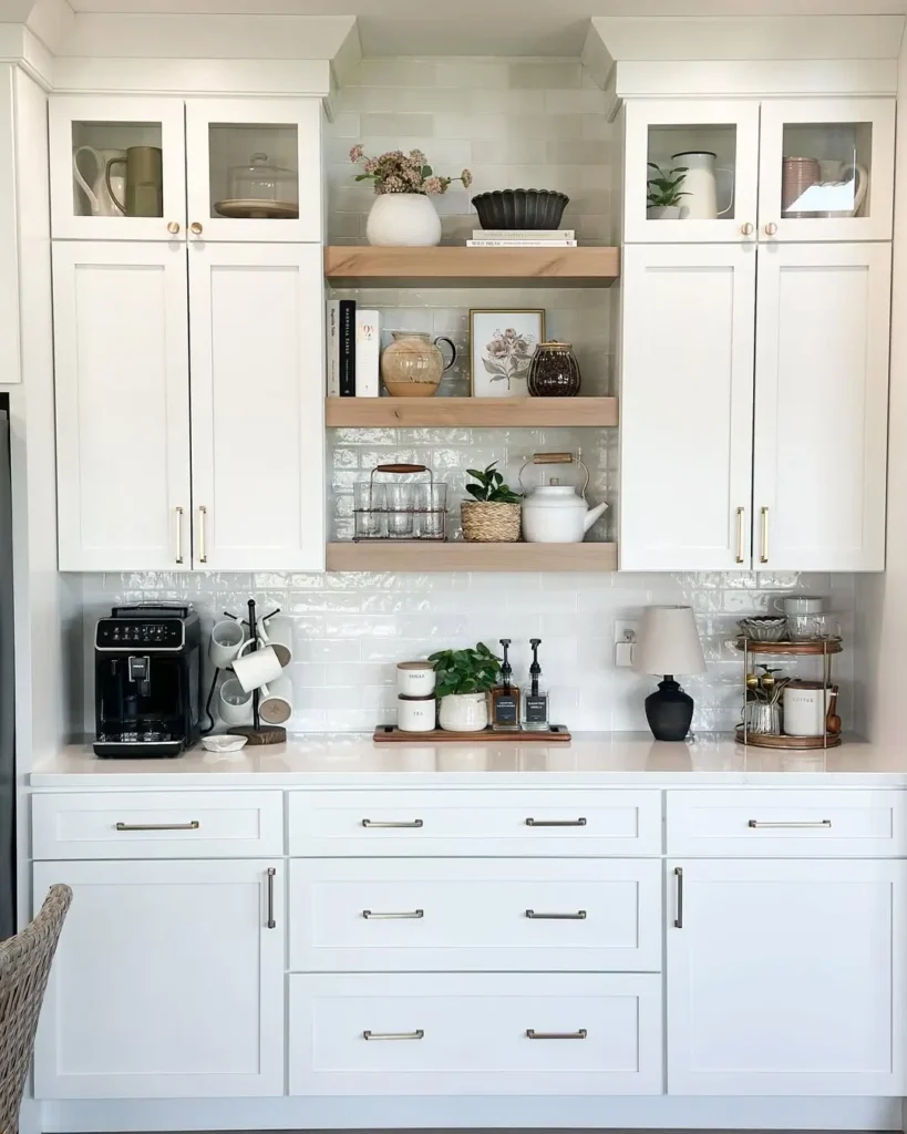 White surfaces, simple organization, and zero extra decor create a calm, functional coffee bar. Ideal if clutter stresses you out and you love simplicity.